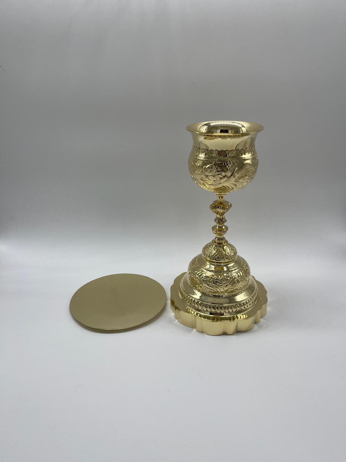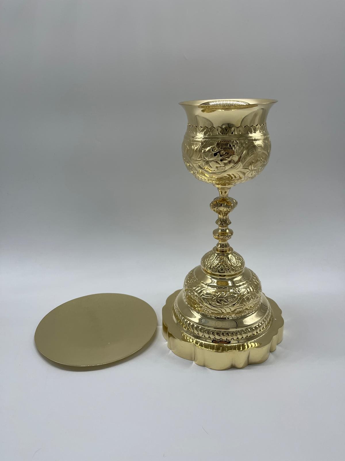 Cáliz con Patena asombroso con tallado. Las medidas del Cáliz 31 cm y Patena 17,5 cm (Capacidad 473ml)