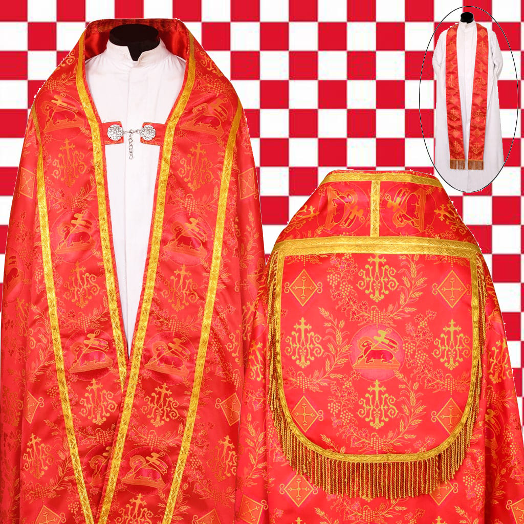 Capa Pluvial JHS agnus roja Agnus Dei con estola a juego. El tejido damasco con acabados de seda con diseño JHS y Agnus Dei (Altura de la capa 152 cm) disponible con forro con otro precio.