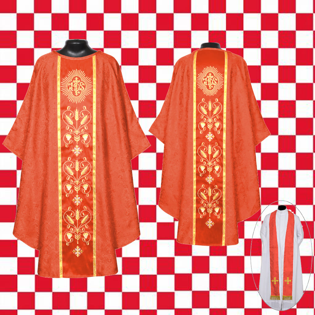 Casulla Gótica JHS espiral con estola a juego. Confeccionada en tela brocada con bordados. Los Orpherys en tela de seda y bordados. La estola mide 121,90 cm con una cruz en la parte inferior, una pequeña cruz dorada en la parte posterior del cuello y flecos en los extremos. Se puede elegir la talla de la casulla. Disponible con forro y sin forro, con forro un coste añadido.