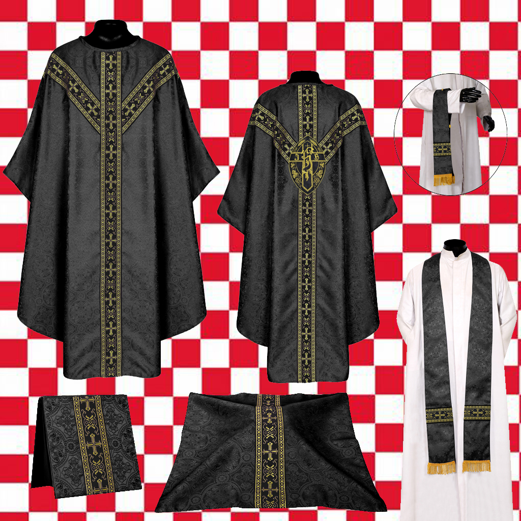 Casulla Gótica Misa jhs que incluye un velo de cáliz, un manípulo, una carpeta y una estola. La vestimenta está hecha de tela de damasco con acabado de seda y diseños de cruces. Los diseños están hechos de trenzas de poliéster de alta calidad con motivo JHS parte posterior.