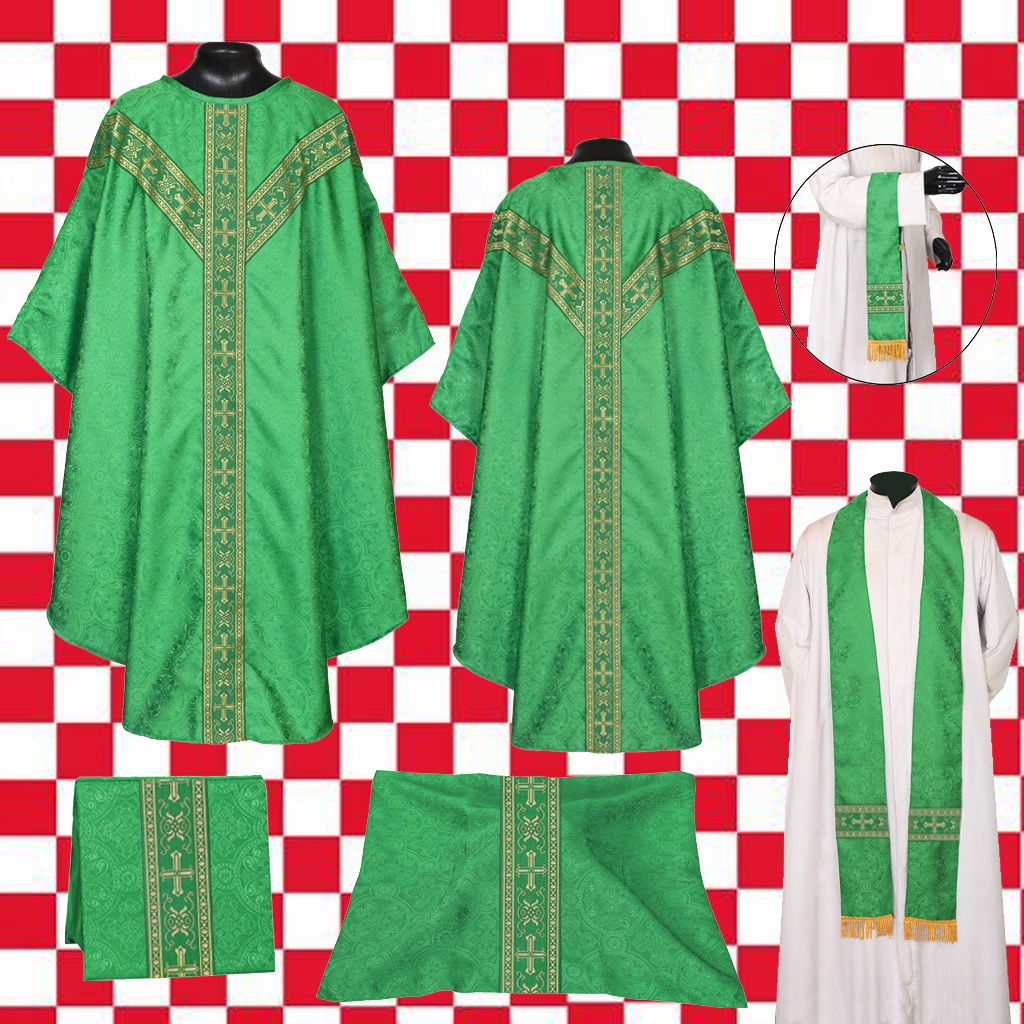 Casulla Gótica Misa que incluye un velo de cáliz, un manípulo, una carpeta y una estola. La vestimenta está hecha de tela de damasco con acabado de seda y diseños de cruces. Los diseños están hechos de trenzas de poliéster de alta calidad.