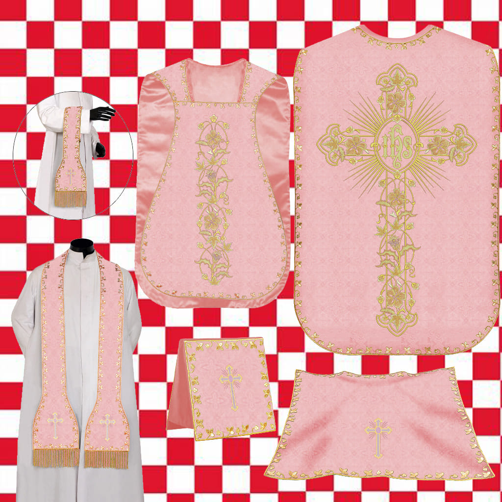 Casulla Romana-Guitarra cruz bordada con los complementos de velo de cáliz, manípulo, carpeta y una estola, todos confeccionados con tela iglesia damascada con diseño de cruz. La Casulla está bordada con diseños de Cruz y los extremos están bordados con diseños florales. Los interiores están forrados con tela satinada a juego. La Casulla se entrega con el cordón atado. Los complementos totalmente bordados.