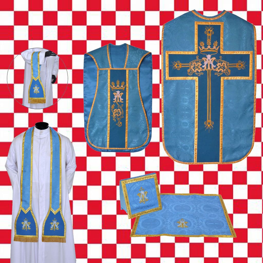Casulla Romana- Guitarra cruz M con los complementos velo de cáliz, un manípulo, carpeta y una estola. El material de las prendas es de tela Damasco/Brocado con diseños de Cruz. Los orfreys están hechos de tela Velvet y los diseños están bordados a mano con hilo dorado metalizado. Los interiores están forrados con tela Satin a juego. La Casulla se entrega con el cordón atado