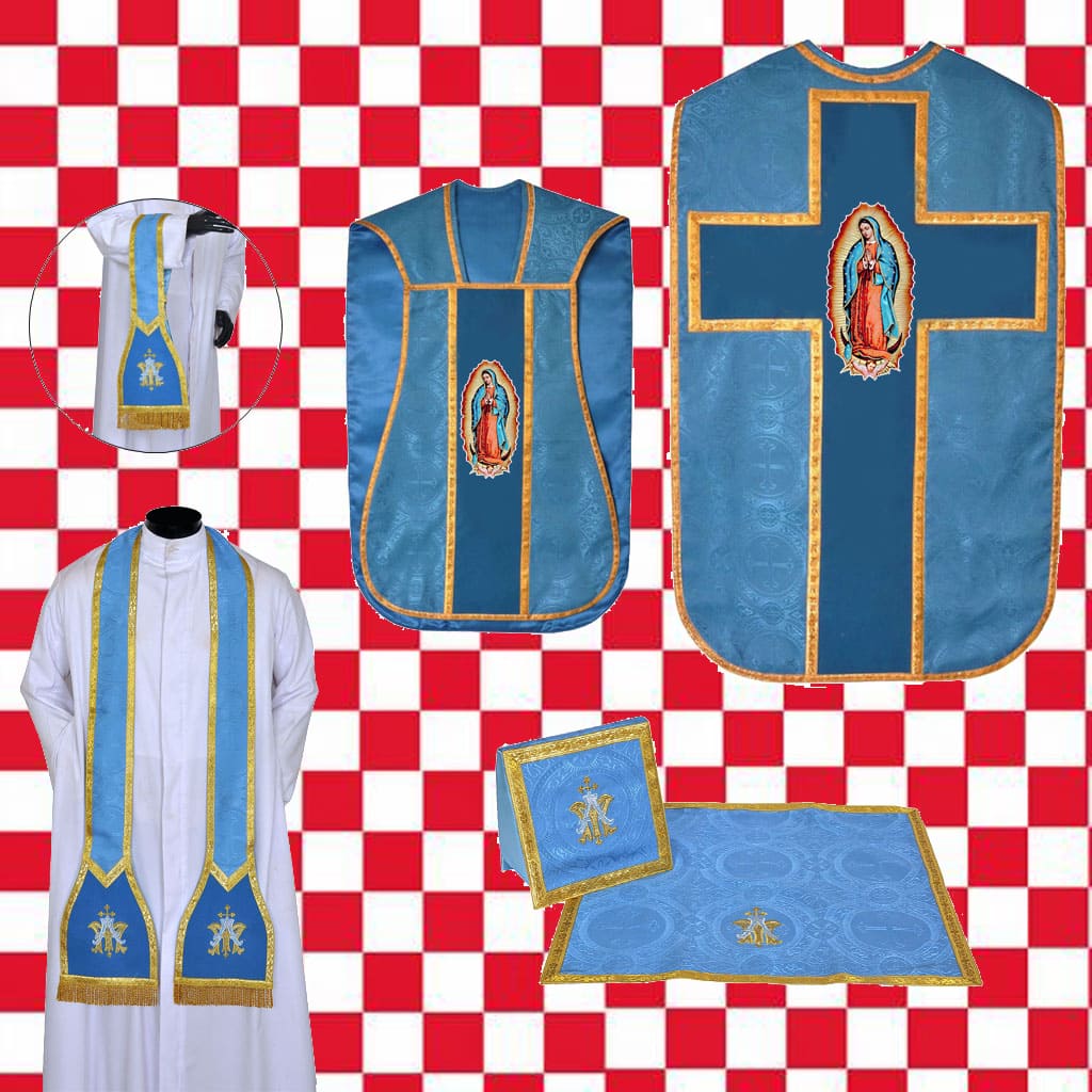 Casulla Romana-Guitarra guadalupe con los complementos de estola, manípulo, velo cáliz y carpeta. El tejido es damasco con diseños en cruz. Los orpherys son de seda ribeteados en oro y el motivo central es la Virgen de Guadalupe. El interior es forrado con tela satinada. Cordón con casulla. Se puede confeccionar en tres modos: