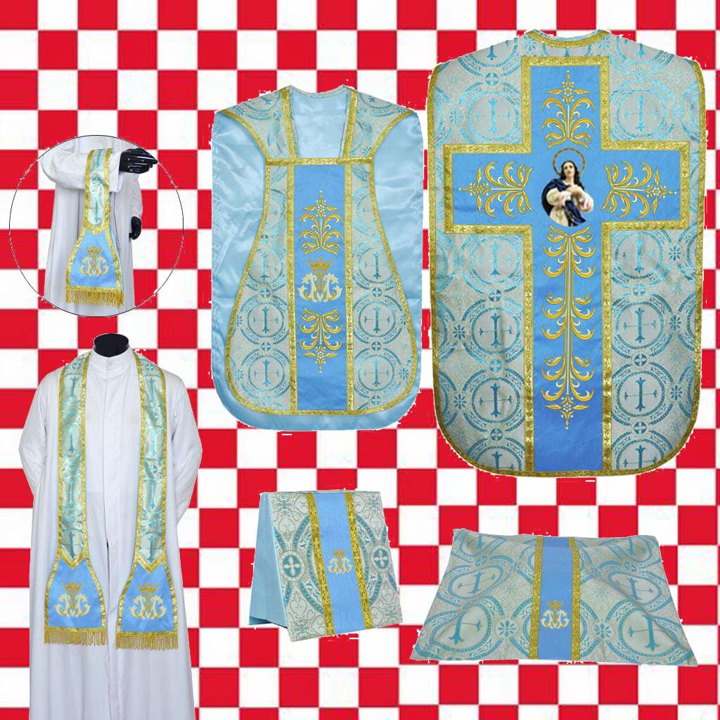Casulla Romana-Guitarra inmaculada con todos los complementos de velo, carpeta, manípulo y estola. Por delante se encuentra el olograma de María y por detrás una imagen de la Inmaculada Concepción. Cordón a juego dentro de la Casulla.