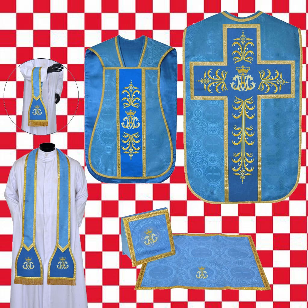 Casulla Romana-Guitarra M corona con los complementos de velo de cáliz, manípulo, carpeta y una estola. El material está hecho de tela Brocada con diseño de cruz. La Casulla está bordada con diseños de Cruz y los extremos están bordados con diseños florales. Los interiores están forrados con tela Satinada a juego. La Casulla se entrega con el cordón atado.