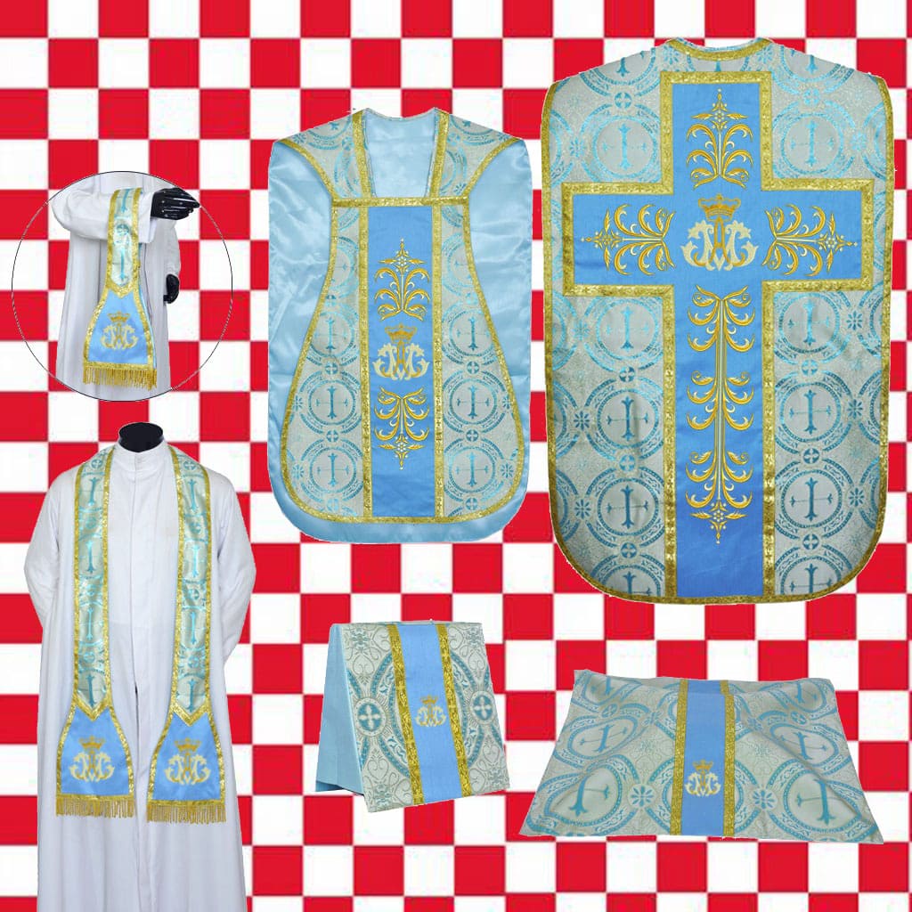 Casulla Romana-Guitarra M con los complementos de velo de cáliz, manípulo, una carpeta y una estola. El material está hecho de tela Brocada con diseño de cruz. La Casulla está bordada con diseños de Cruz y los extremos están bordados con diseños florales. Los interiores están forrados con tela Satin a juego. La Casulla se entrega con el cordón atado