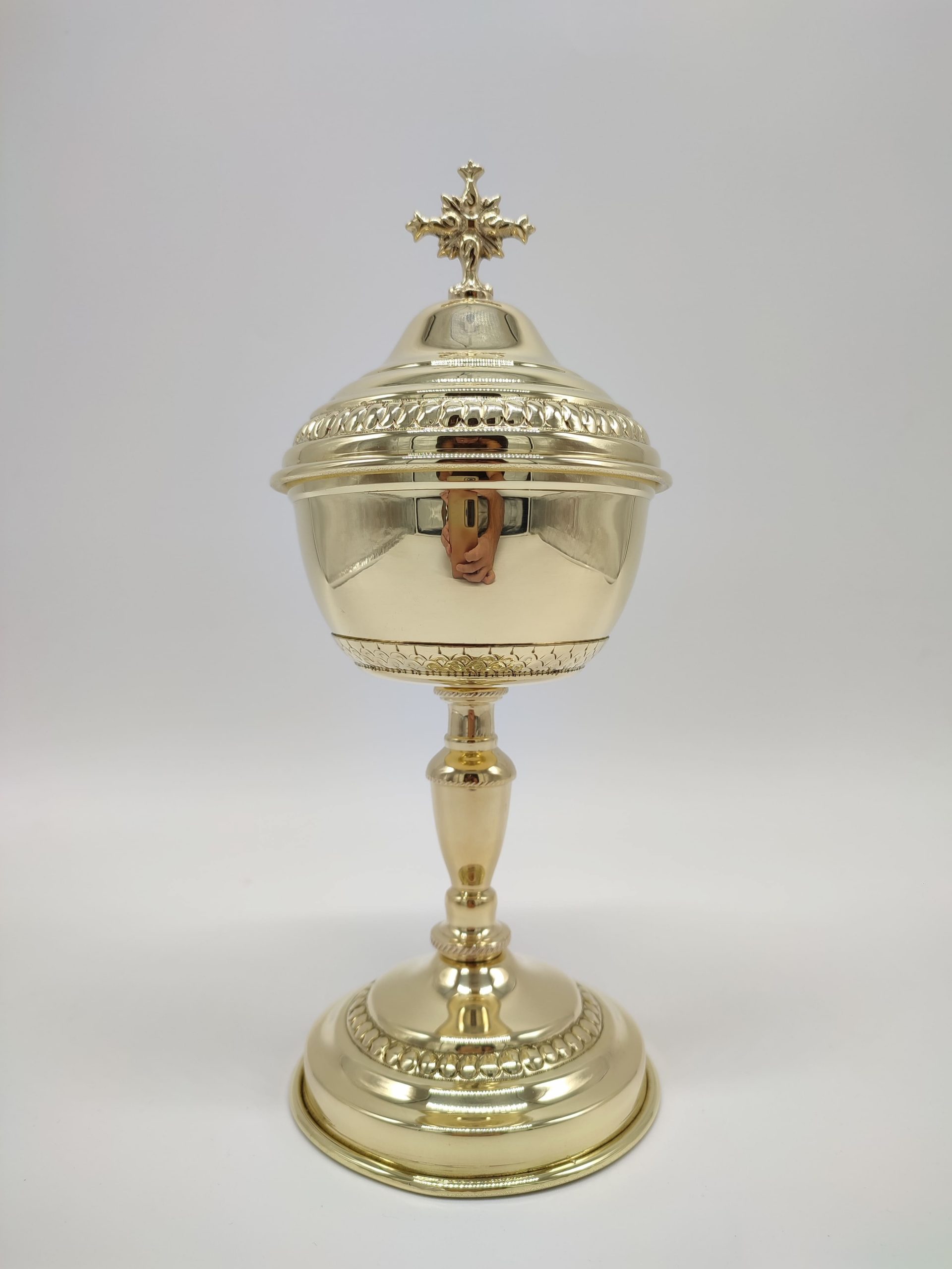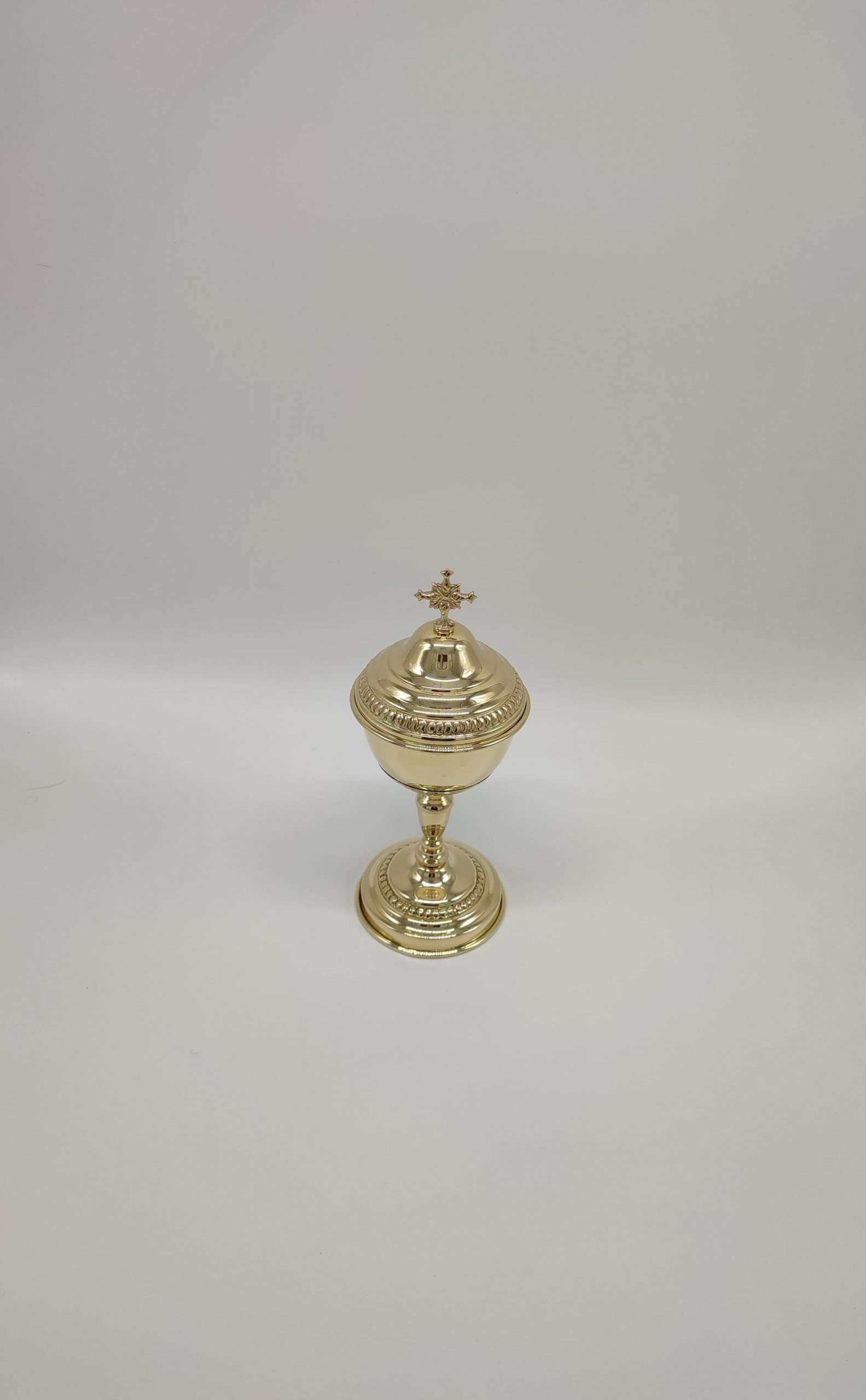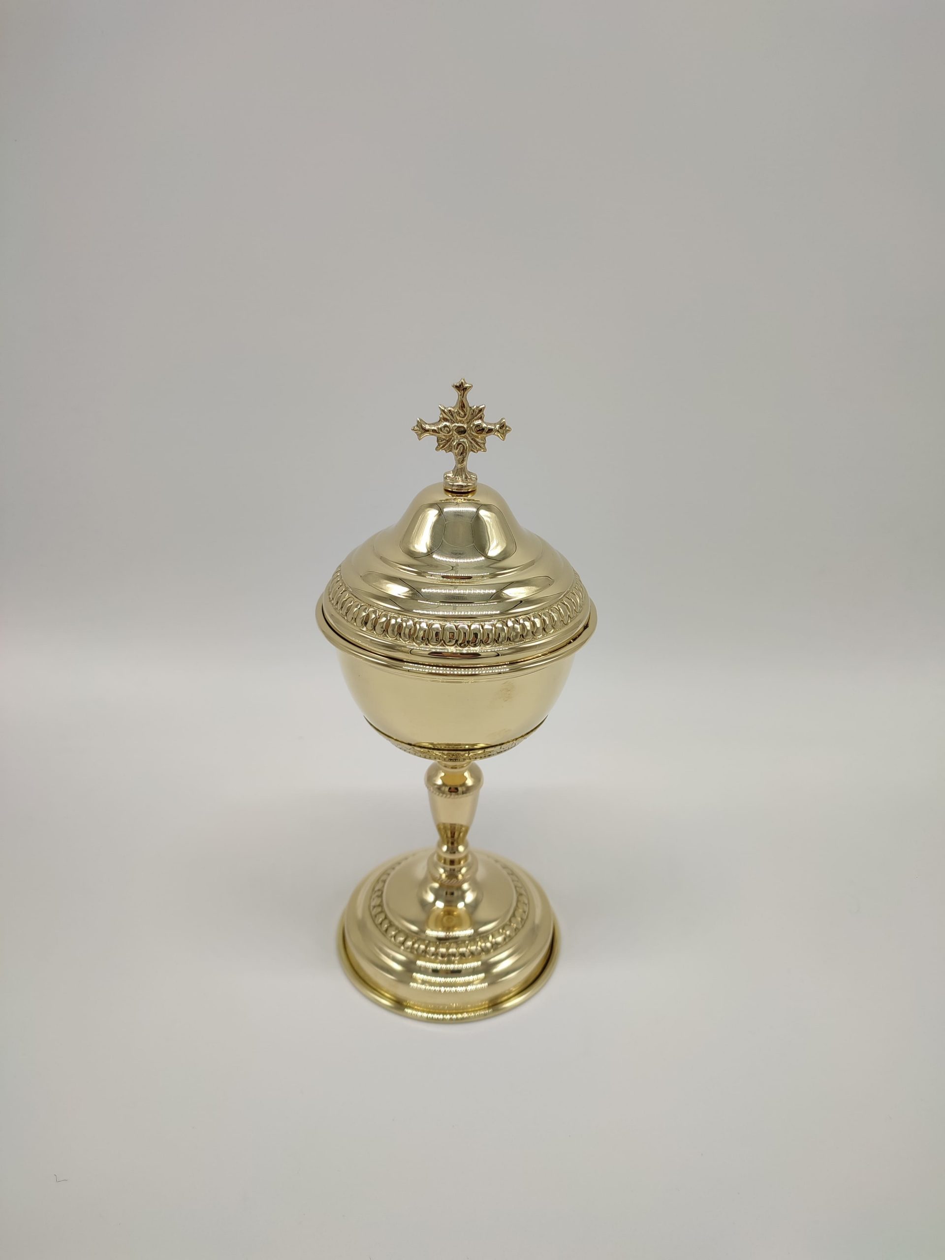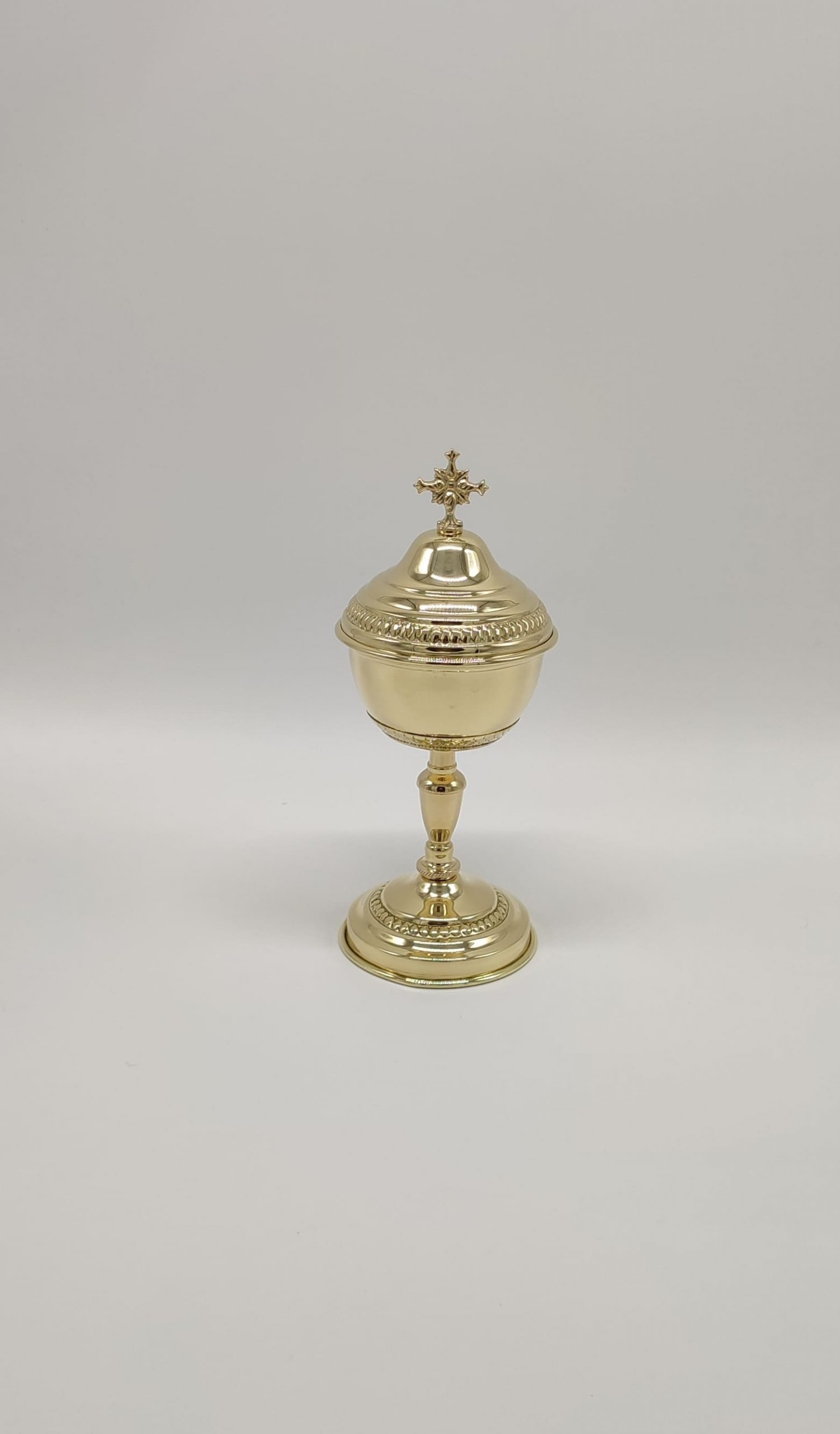 Copón renacentista cincelado de latón 25,4 cm de alto x 6,5 cm de ancho x 6,5 cm de profundo.