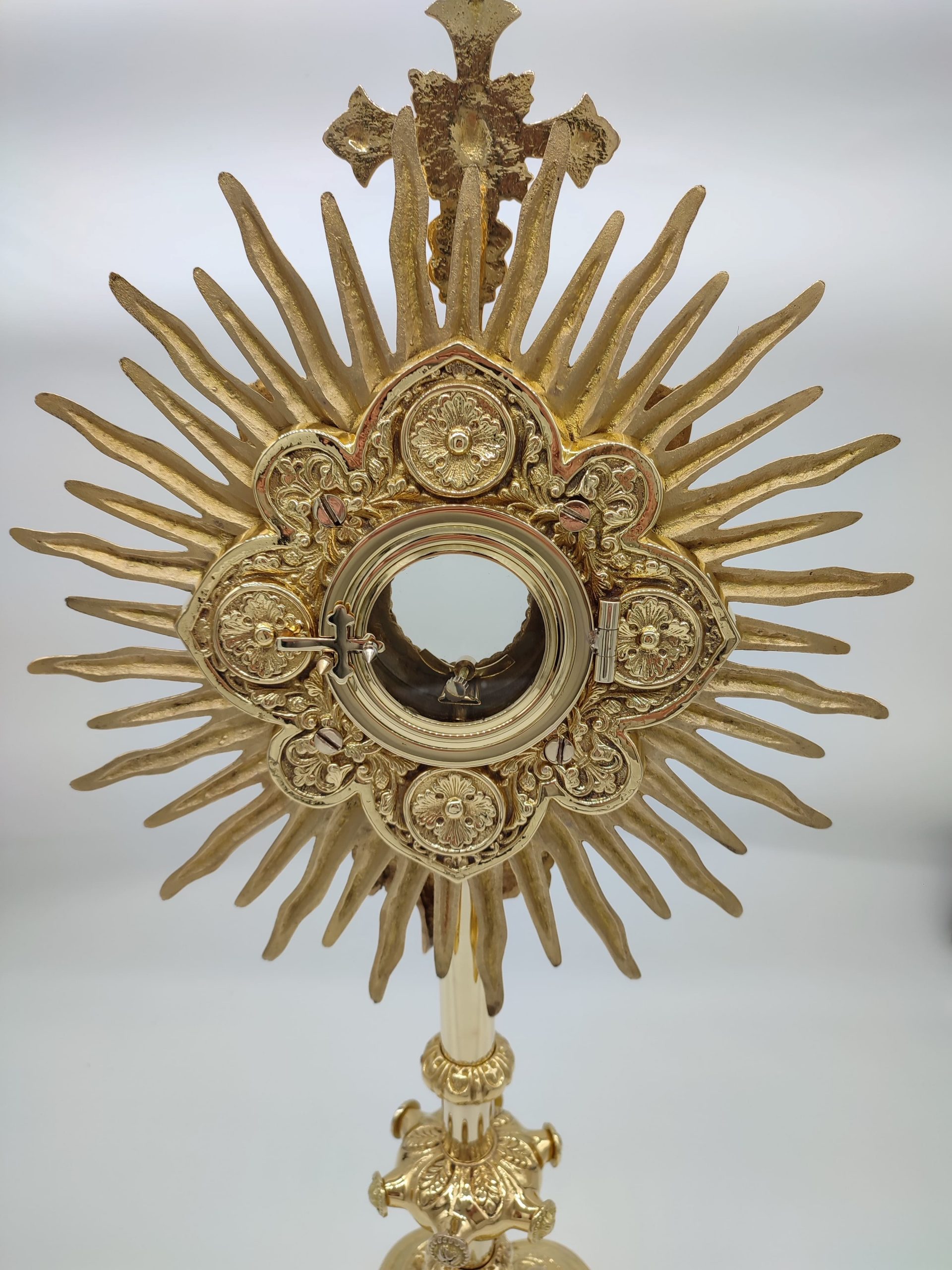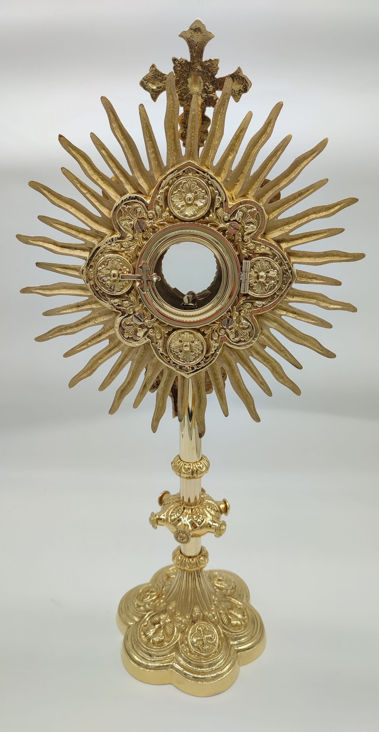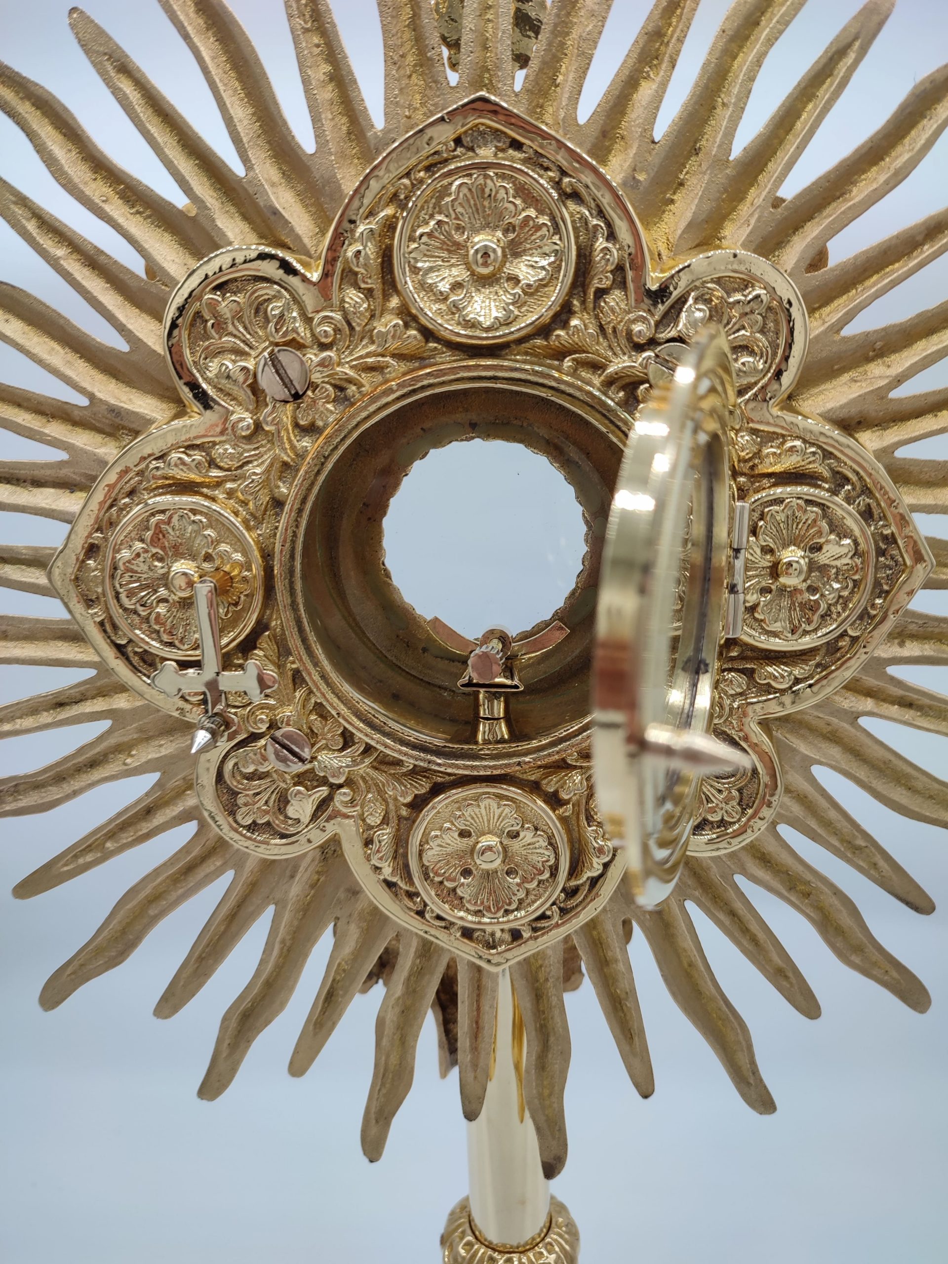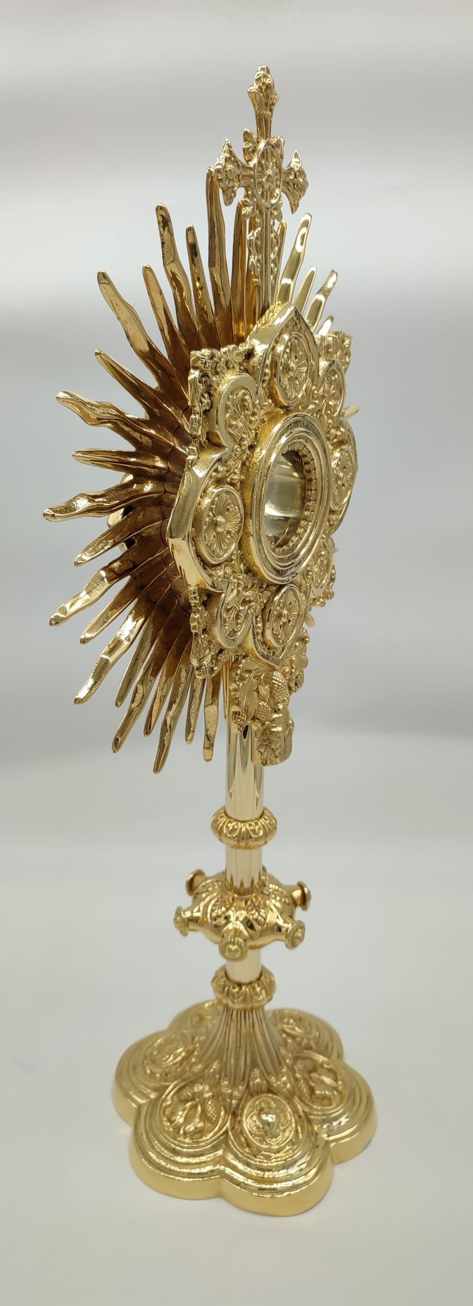 Custodia Italiana labrada de latón con diseños muy creativos y disponible en varios acabados. Las medidas 59 cm de alto x 30 cm ancho. Porta reliquias 7,3 cm diámetro x 4,9 cm profundo. Disponible también con estuche.