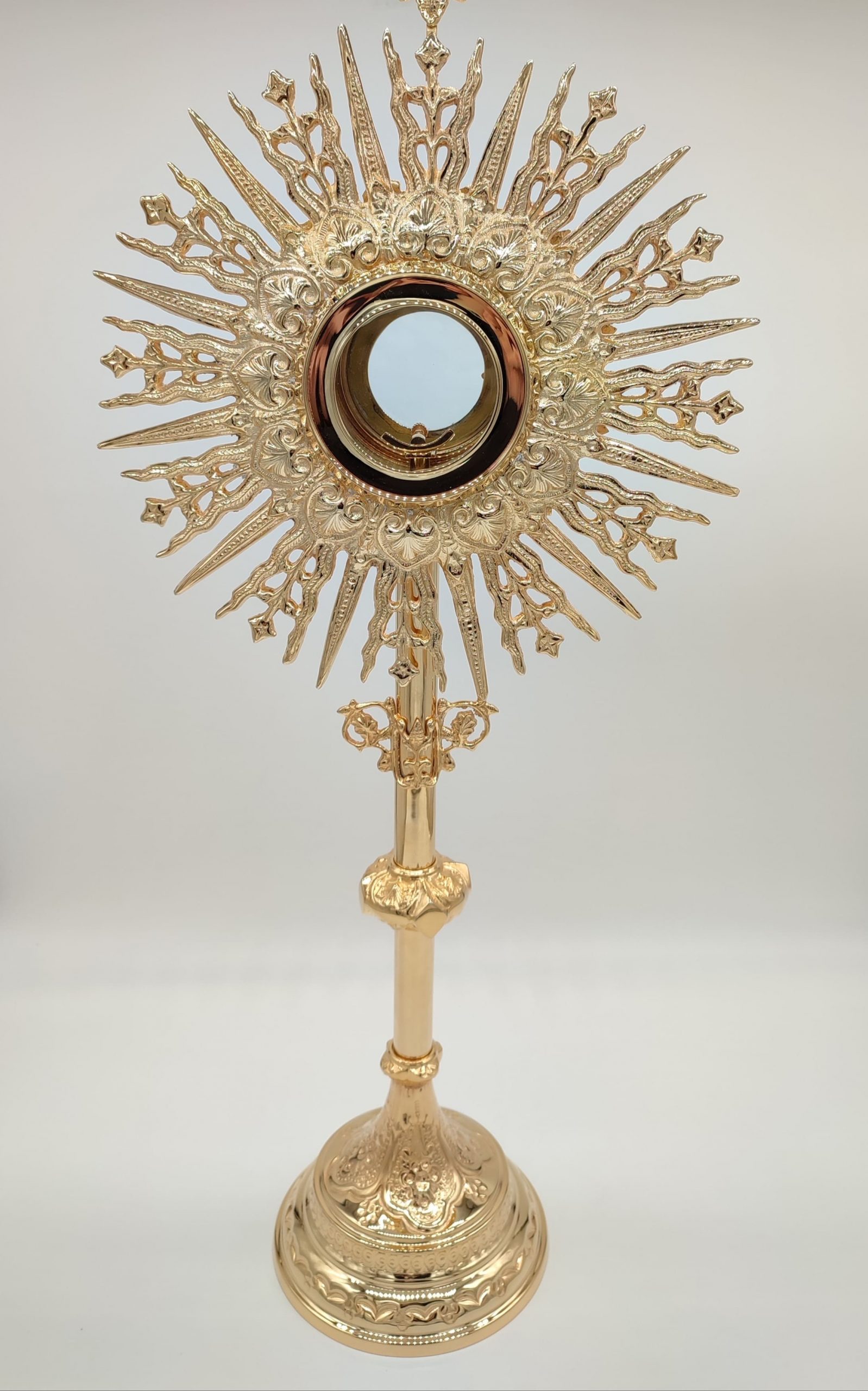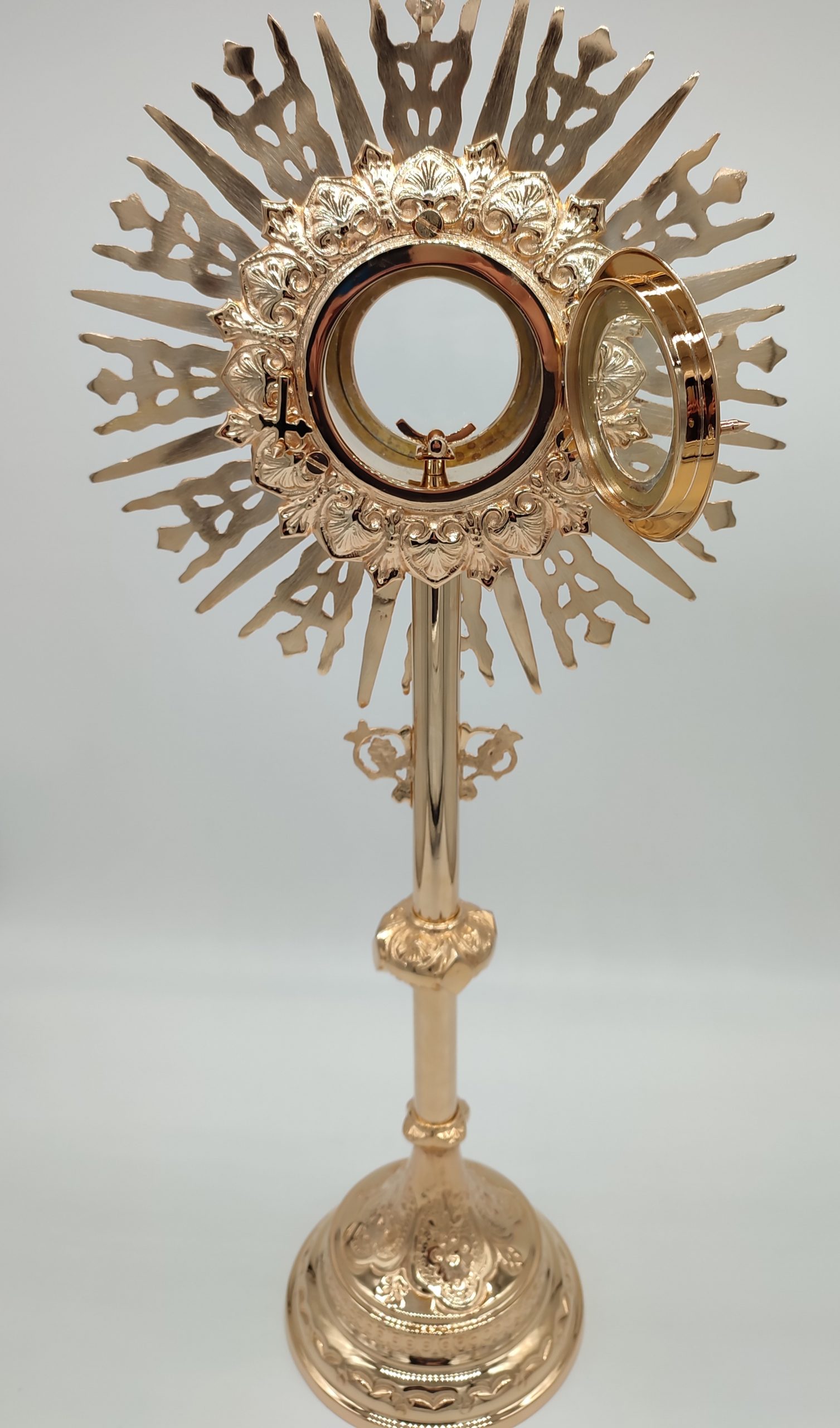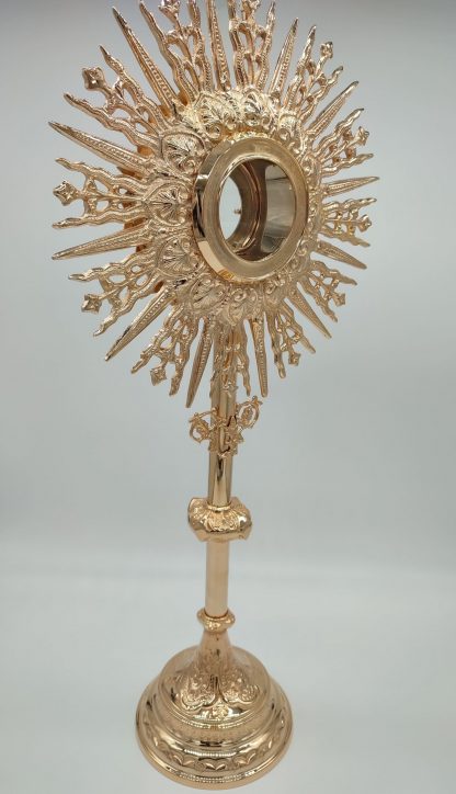Preciosa Custodia italiana de Latón de 72cm de alto x 30,5 cm de ancho, el diámetro del porta reliquias 8,5cm x 5,2 profundo. Está muy bien realizada artesanalmente. Disponible en varios acabados. Alto pulido, alto pulido y lacado, niquelado (plateado), chapado en oro. Disponible también con estuche bajo pedido, el estuche está hecho de madera con el exterior de terciopelo azul y en el interior de Seda.
