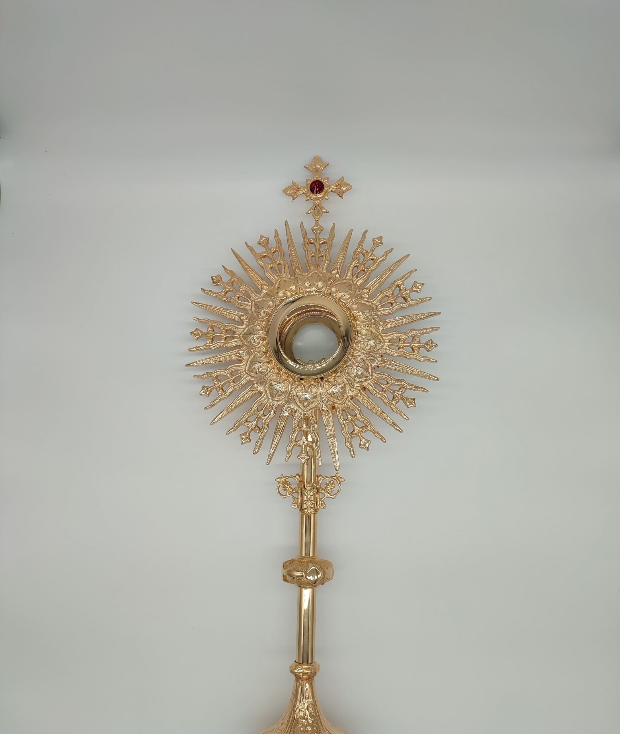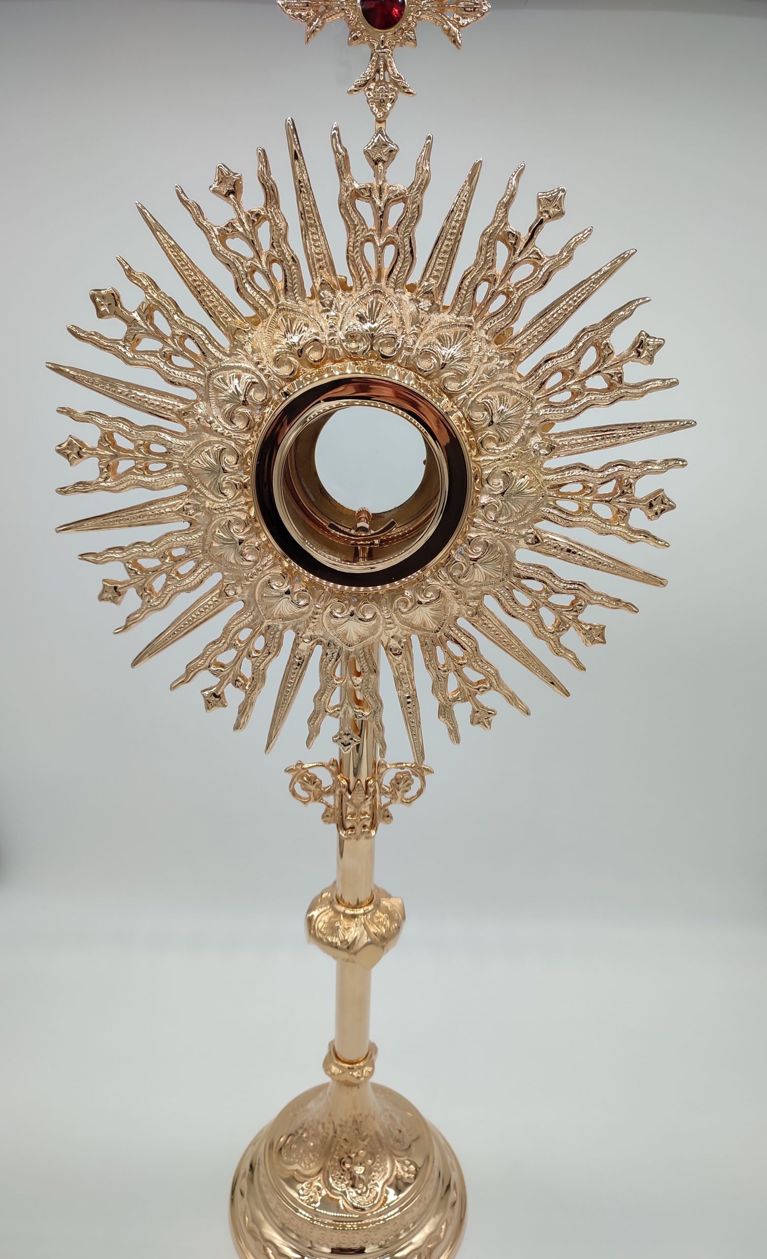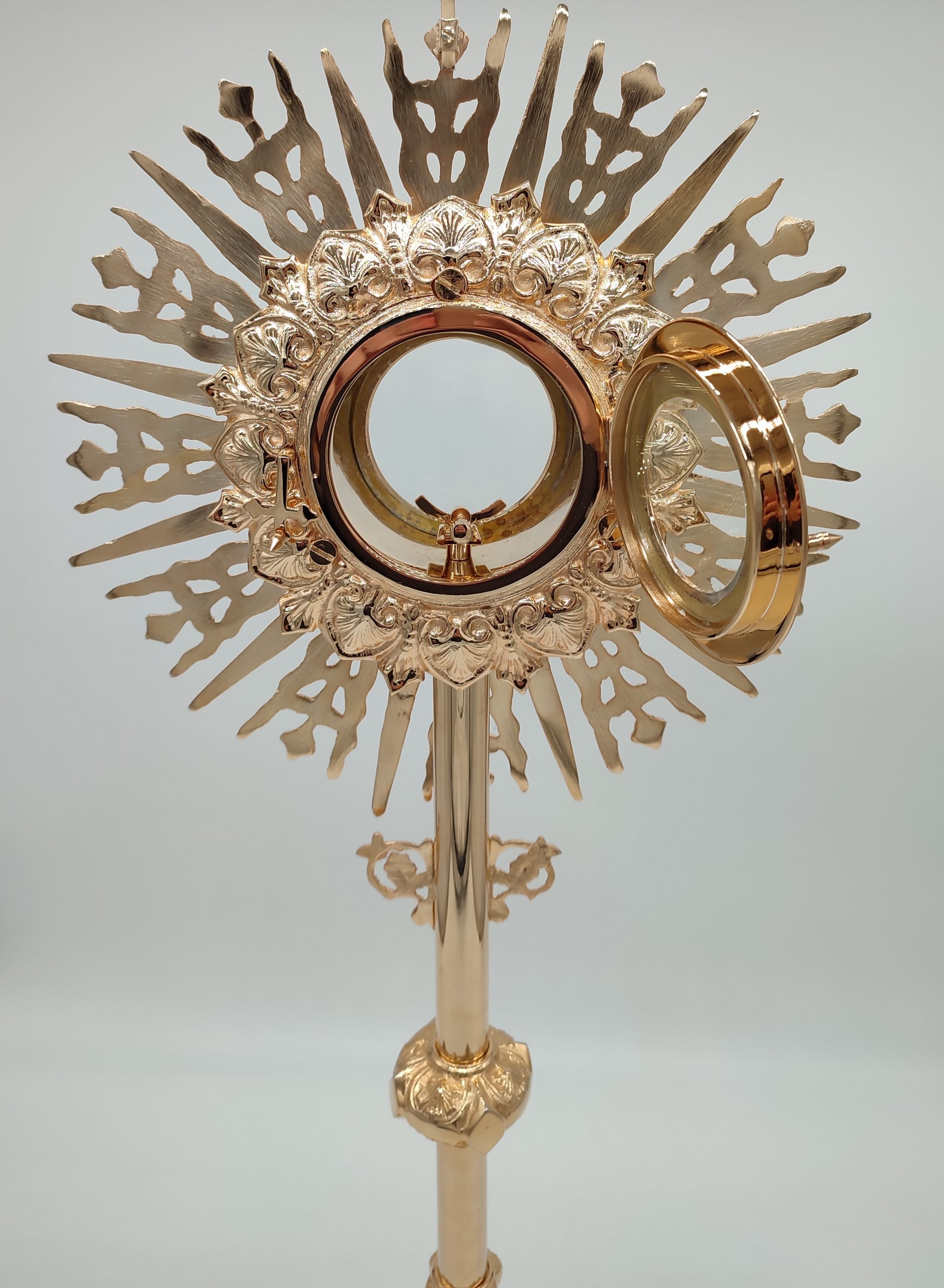 Preciosa Custodia italiana de Latón de 72cm de alto x 30,5 cm de ancho, el diámetro del porta reliquias 8,5cm x 5,2 profundo. Está muy bien realizada artesanalmente. Disponible en varios acabados. Alto pulido, alto pulido y lacado, niquelado (plateado), chapado en oro. Disponible también con estuche bajo pedido, el estuche está hecho de madera con el exterior de terciopelo azul y en el interior de Seda.