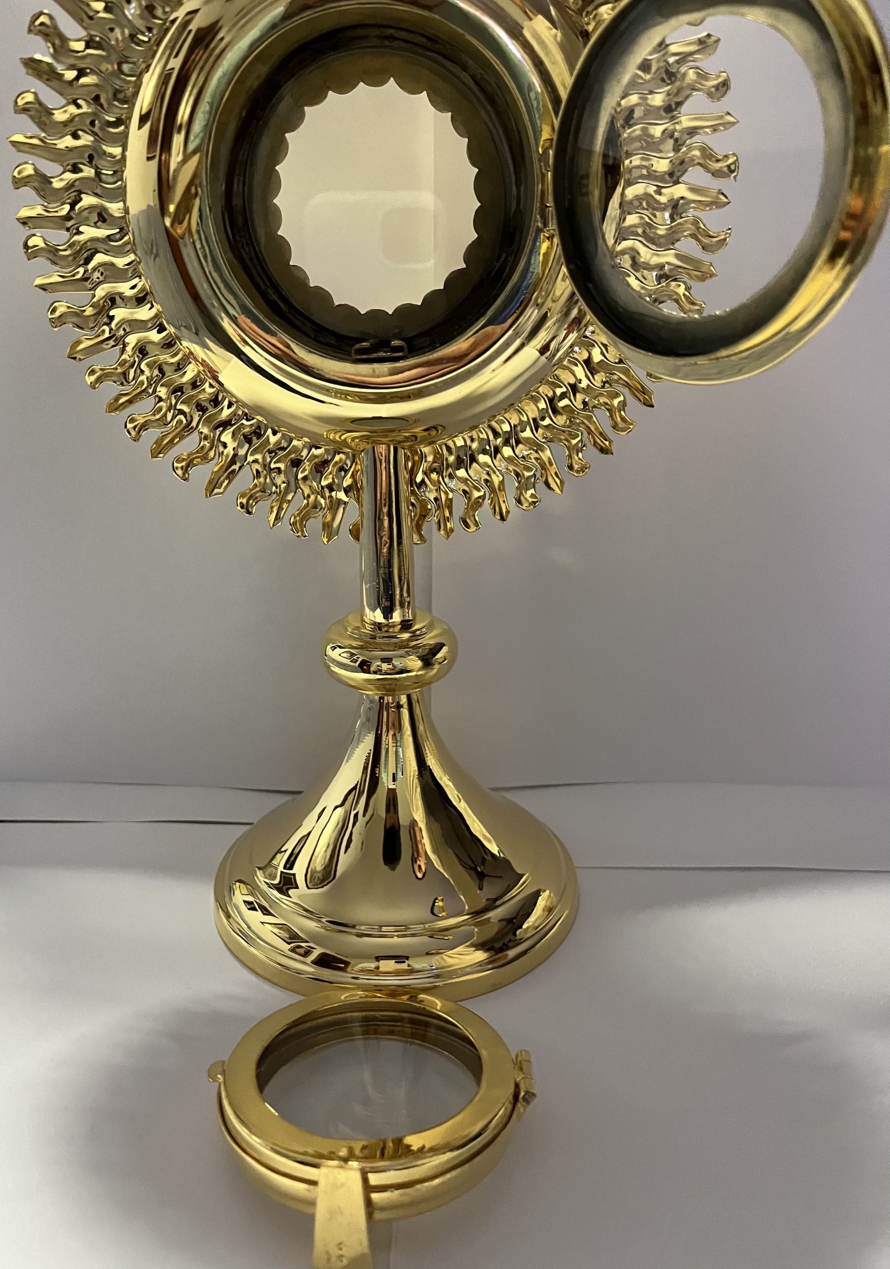 Custodia sol piedra de latón chapado de 33 cm de altura con viril incluido, magnifica y manejable para la exposición del Señor.