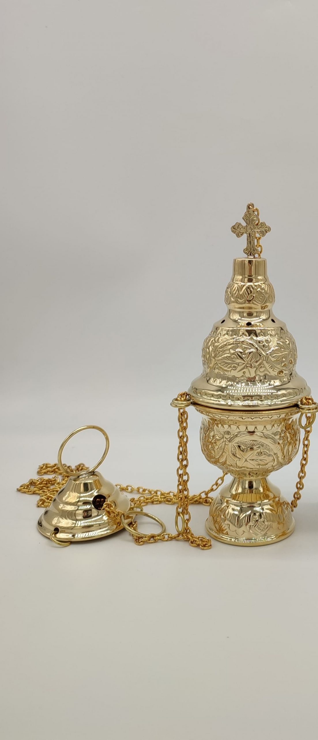 Incensario 4 cadenas o botafumeiro de latón de 4 cadenas. Las medidas del botafumeiro son de 24,3 cm de alto x 9,1cm ancho x 9,1 cm de profundo. Disponible también con naveta y cuchara.
