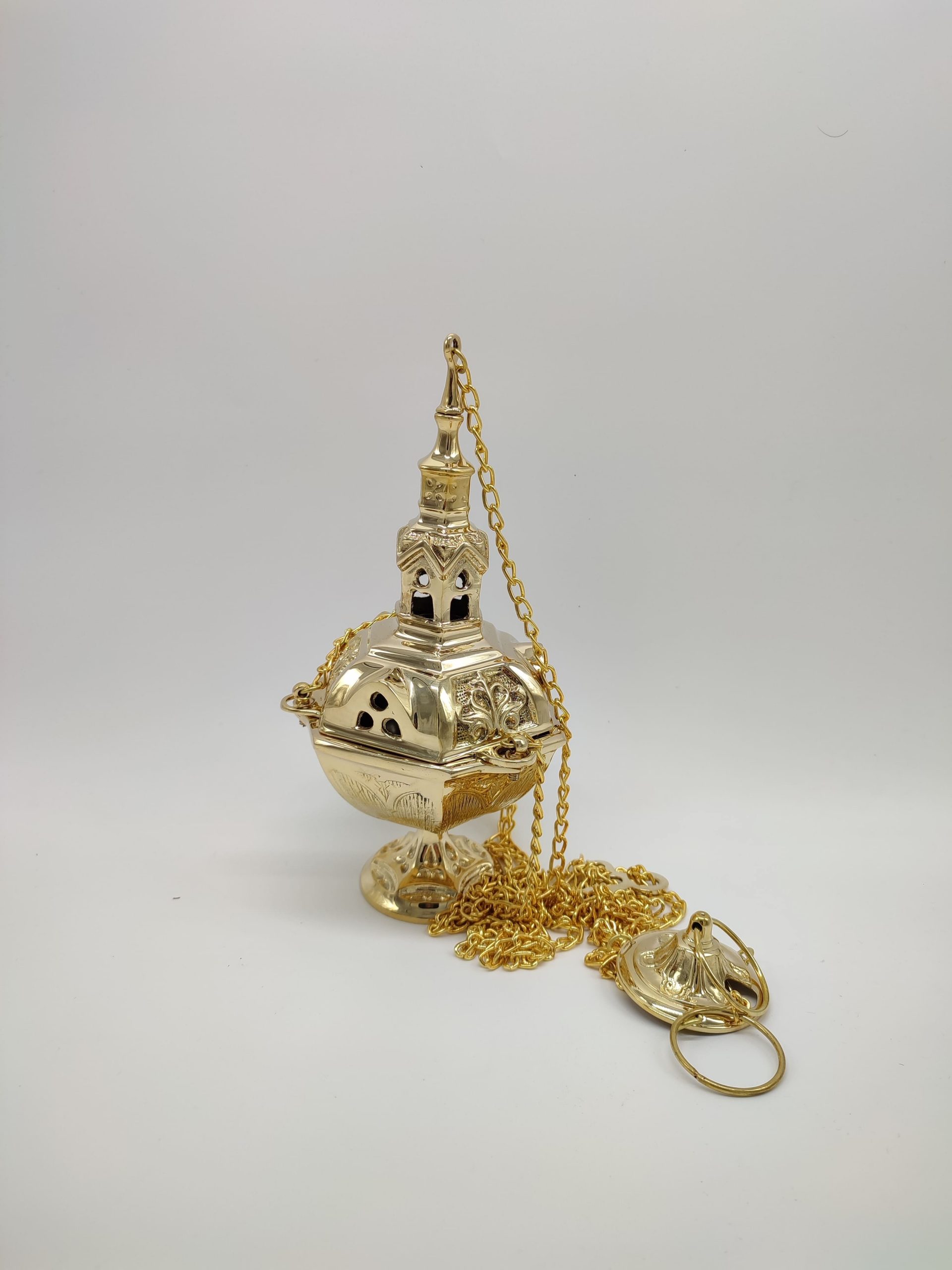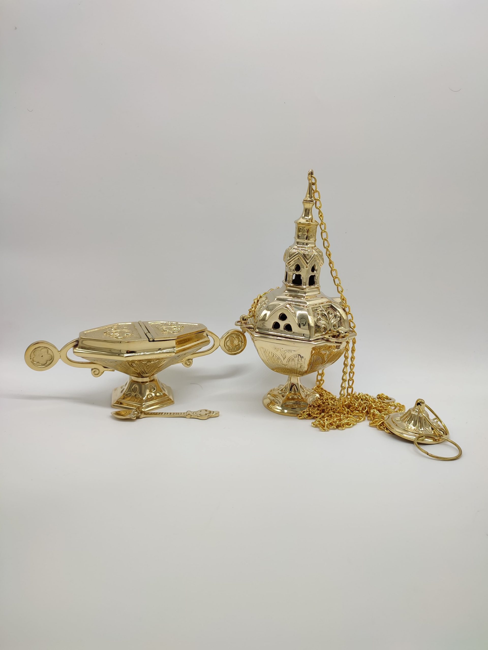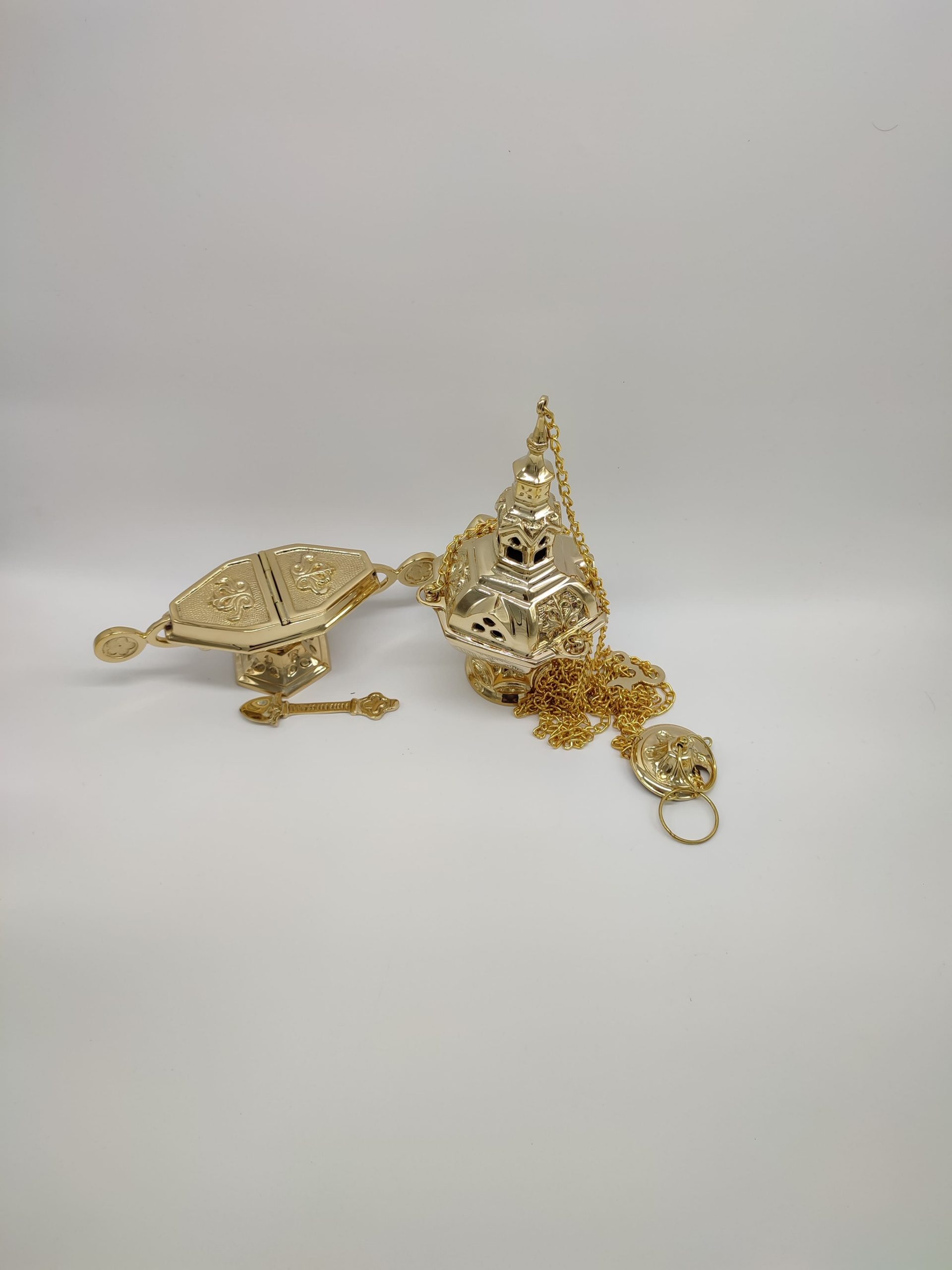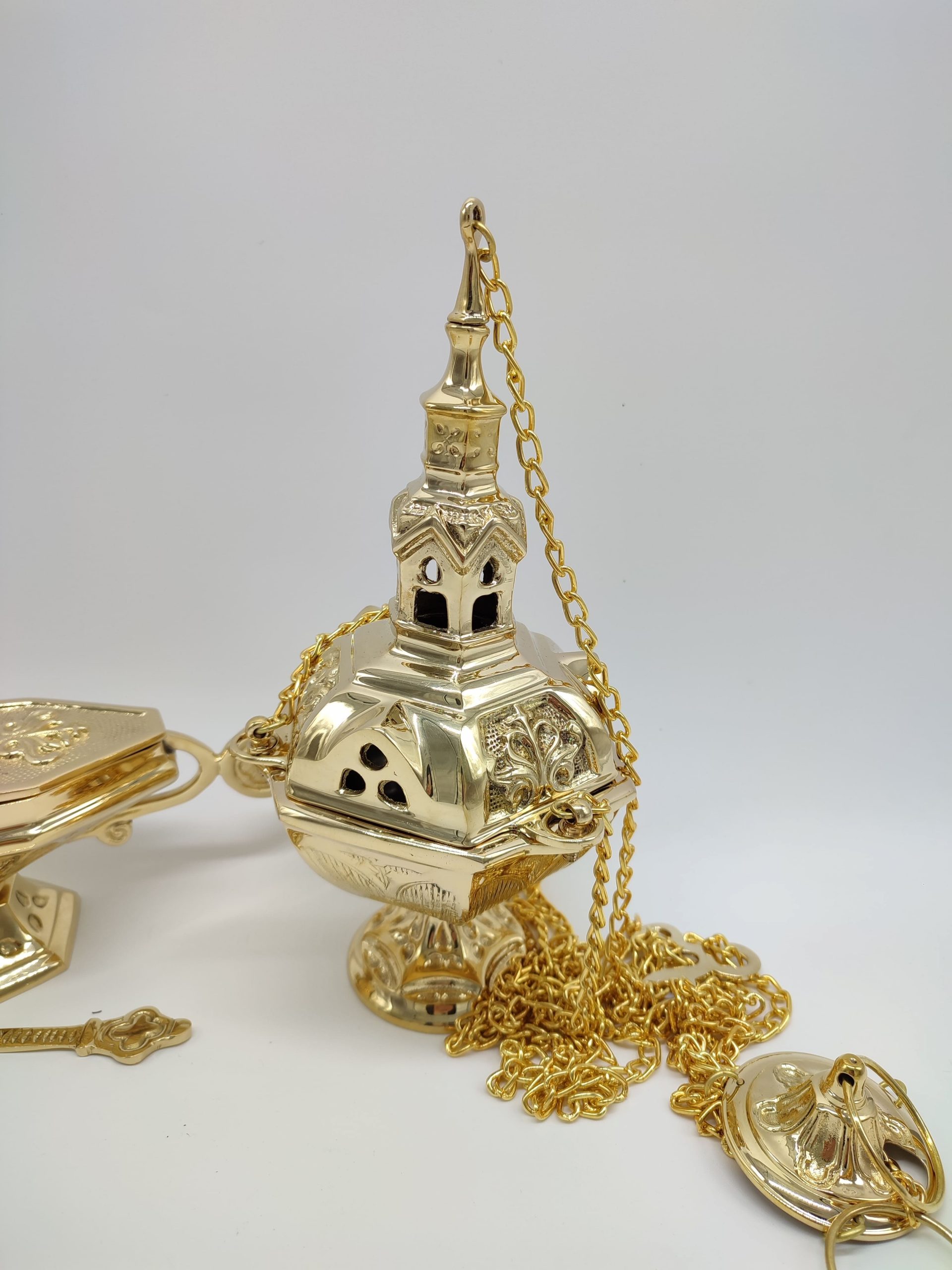 Incensario Neogótico con naveta y cuchara de latón. Las medidas del botafumeiro 27 cm alto. La naveta 9 cm de alto x 26 cm ancho x 8,1 de profundo. Cuchara 11,5 cm de largo. Disponible en niquelado (Plateado) y chapado en oro. A la venta ambas cosas por separado.