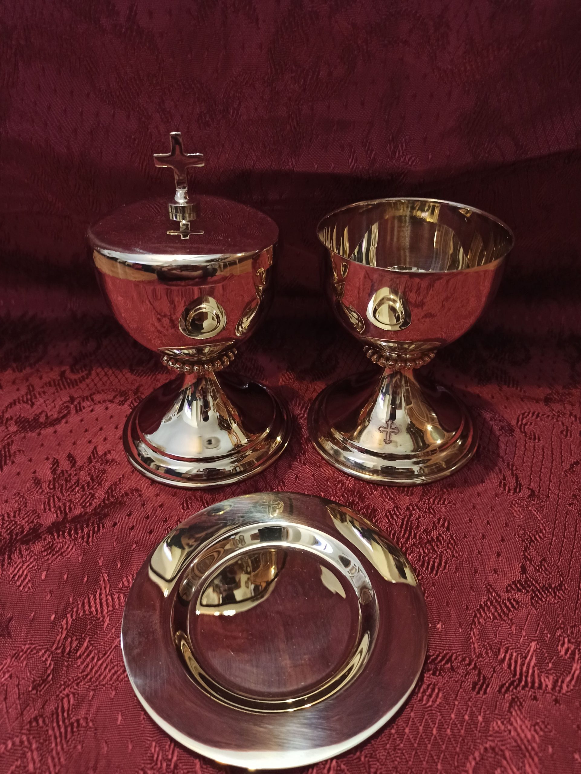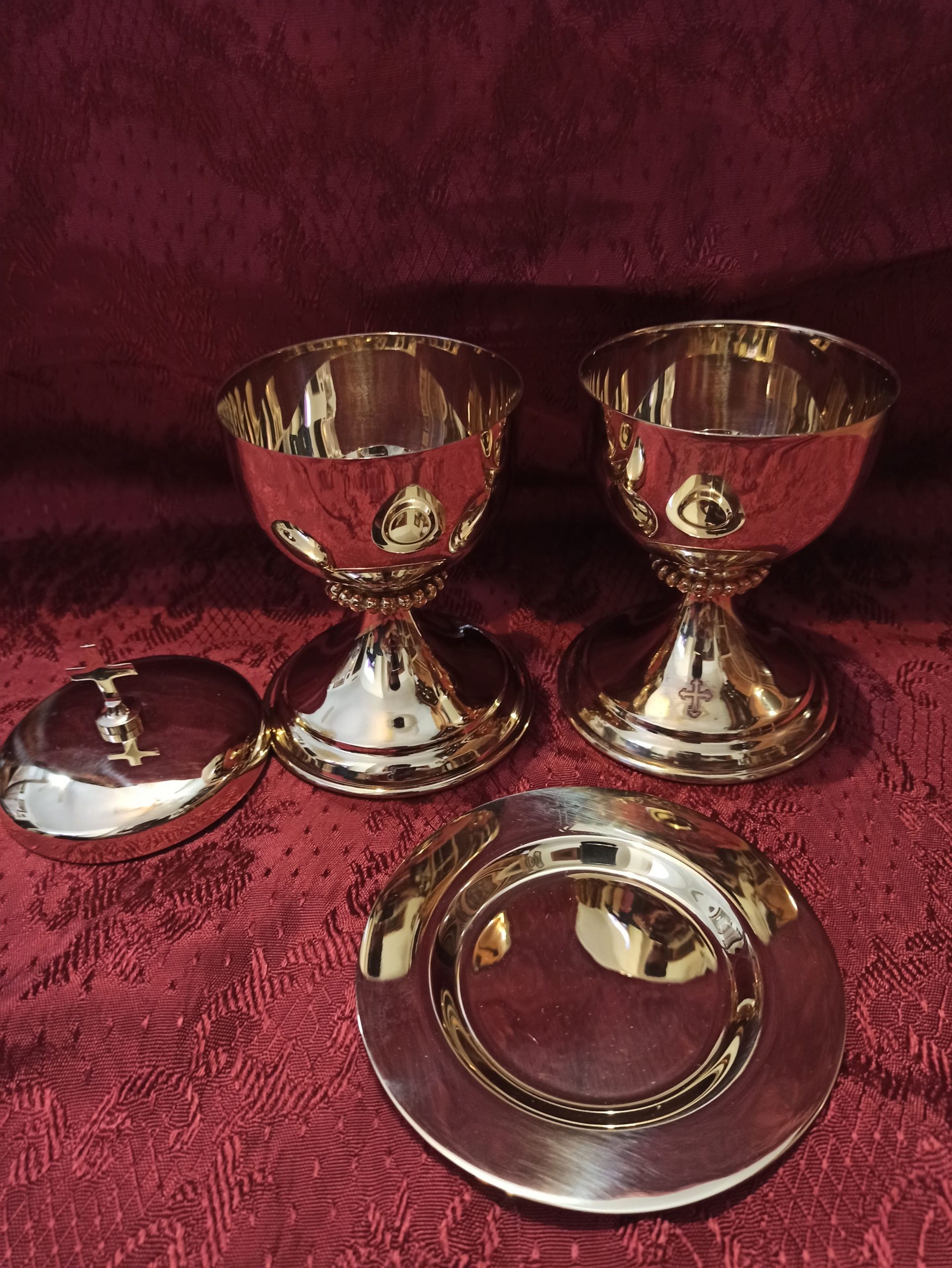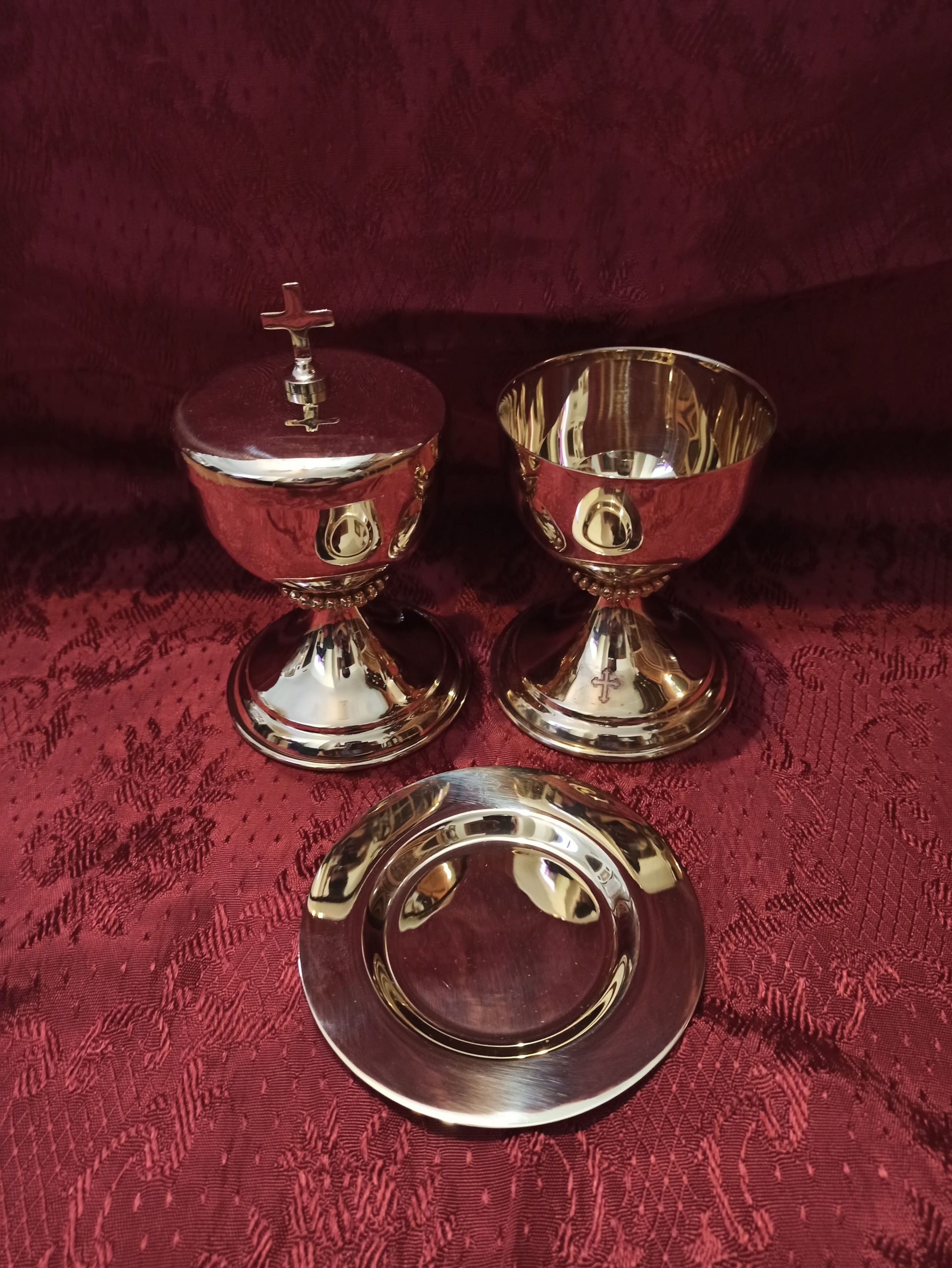 Juego Cáliz Patena y Copón viaje estilo italiano de latón y disponibles en varios acabados. Medidas Cáliz 7,5cm (147 ml capacidad) alto Copón 13,5cm alto (140ml capacidad) Patena 11,5cm.