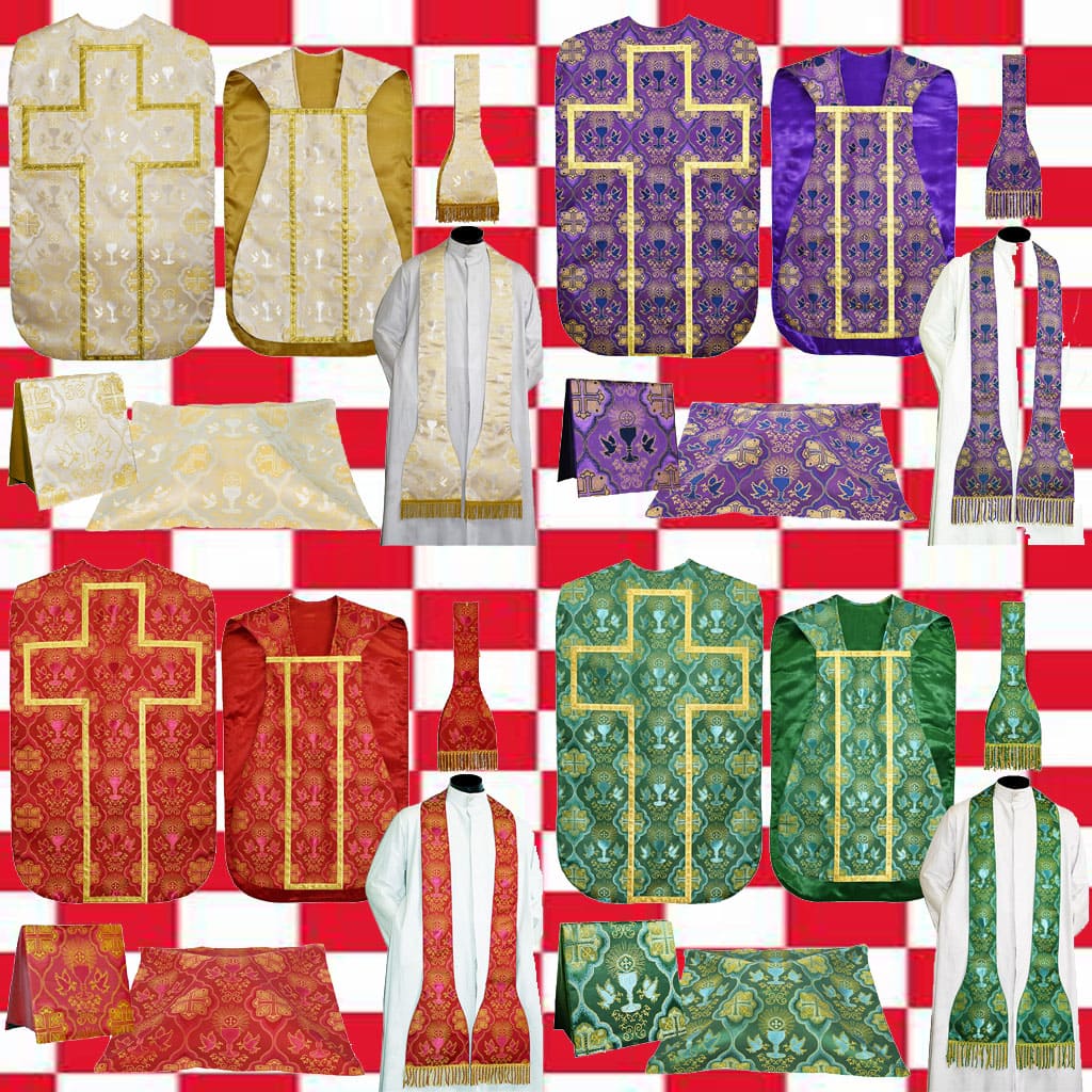 Juego Casullas Romanas-Guitarra cáliz con los colores, rojo, blanco, verde y morado. El conjunto consta de cada Casullas velo de cáliz, manípulo, carpeta y estola. Material Damasco con diseños de Cáliz Eucarístico, Paloma y Cruz. Casullas viene con cordón.