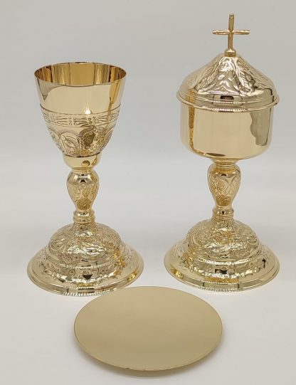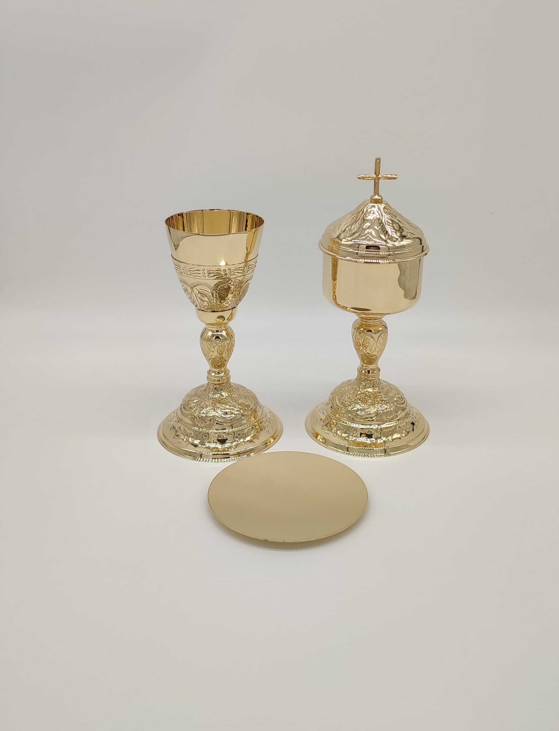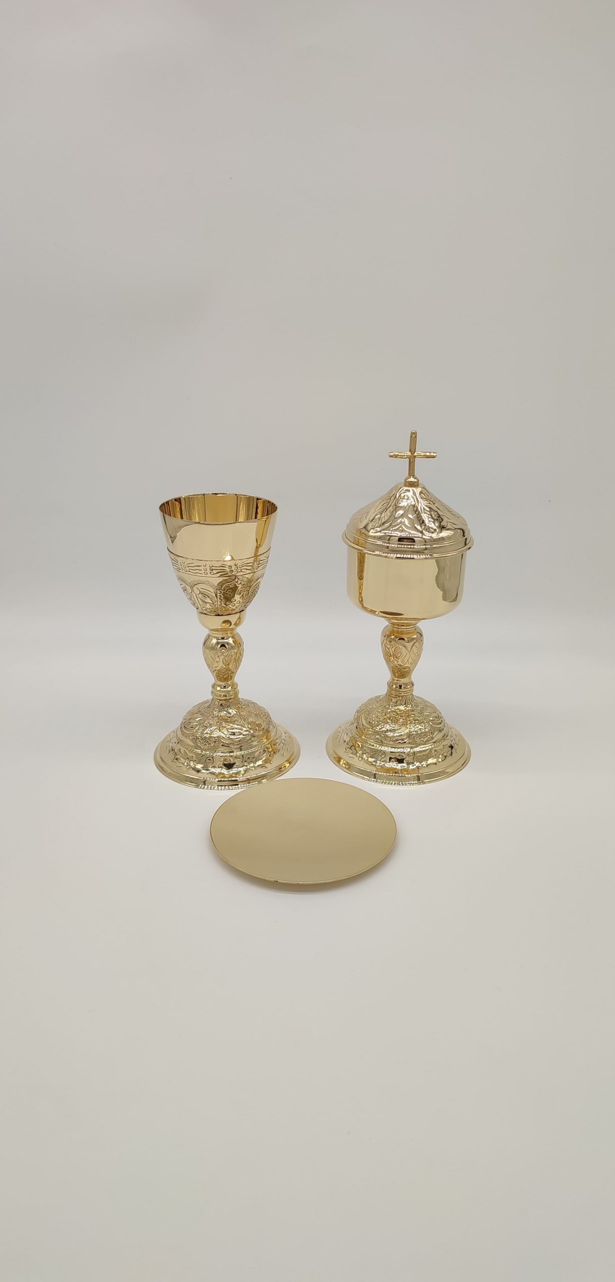 Juego de Cáliz con Patena y Copón tallado de latón. Las medidas del Cáliz 20,3 cm y Copón 23 cm. Tallado en cruz de latón, disponible en varios acabados. Como no también con estuche bajo pedido, el estuche está hecho de madera con el exterior de terciopelo azul y en el interior de Seda.