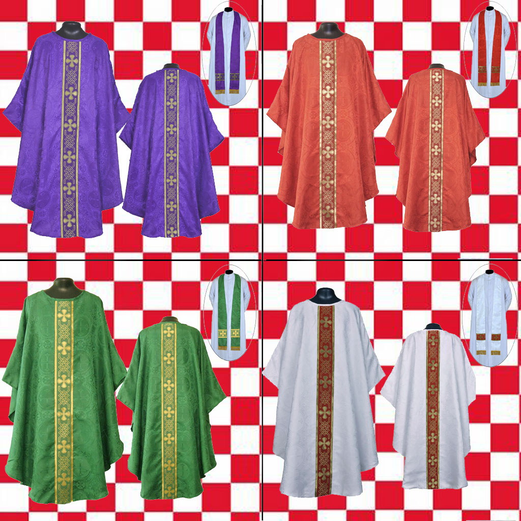 Juego de Casullas Góticas básicas confeccionado en tela de damasco con diseños de cruces y las trenzas de poliéster de alta calidad. La vestimenta incluye una estola a juego.