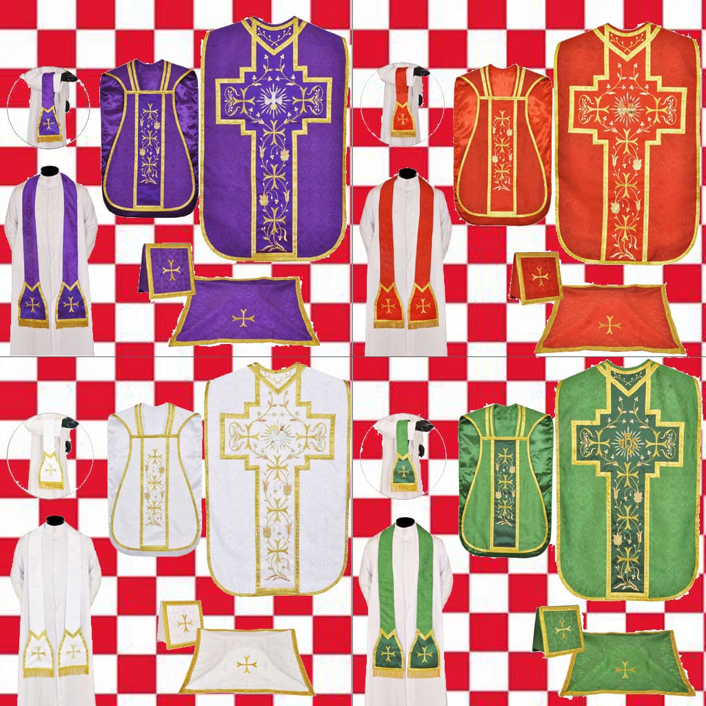 Juego de Casullas Romana-Guitarra alfa. Este diseño de este conjunto de casulla es una nueva versión del diseño de 1893. El material de las prendas es de Damasco acabado con diseños de Cruz. Los ornamentos están hechos de tela de seda y están bordados con diseños que utilizan diferentes colores y tonos de hilos de imitación metalizados de medio oro. El juego incluye un velo de cáliz, un manípulo, una carpeta del corporal y una estola y el juego completo está bordado con una cruz a juego. Las vestiduras, estolas y manípulos están intercaladas y todo el conjunto de masas está forrado con tela satinada a juego desde el exterior. La casulla viene con los cordones adjuntos y la estola y el manípulo están terminados con flecos de oro de calidad fina en los extremos. Cada color contiene una simbología diferente como se puede apreciar en las imágenes.