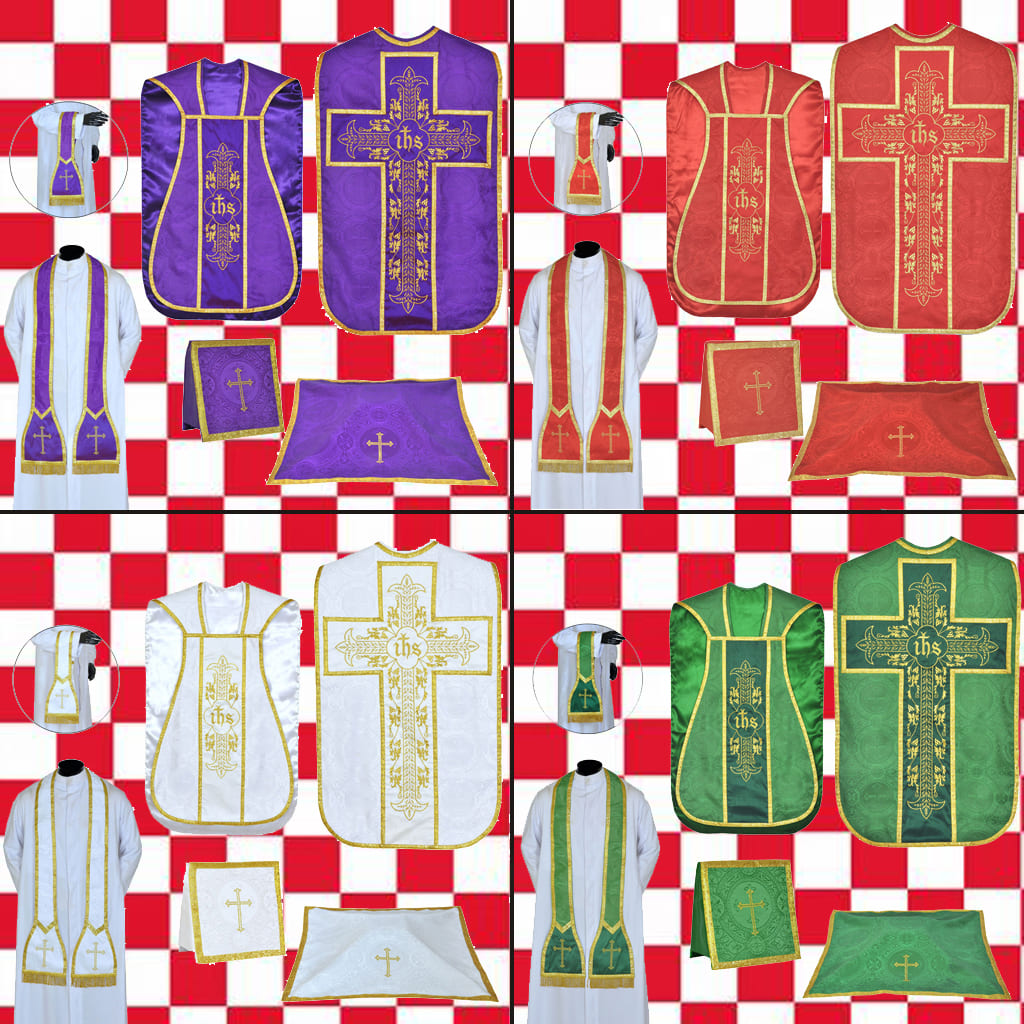 Juego de Casullas Romanas-Guitarra cruz jhs; Rojo, blanco, verde y morado. Incluye veloz de cáliz, manípulo, carpeta y estola. Material damasco con bordados JHS. Los Orpherys con oro metálico. El conjunto forrado con tela satinada. Casulla con cordón
