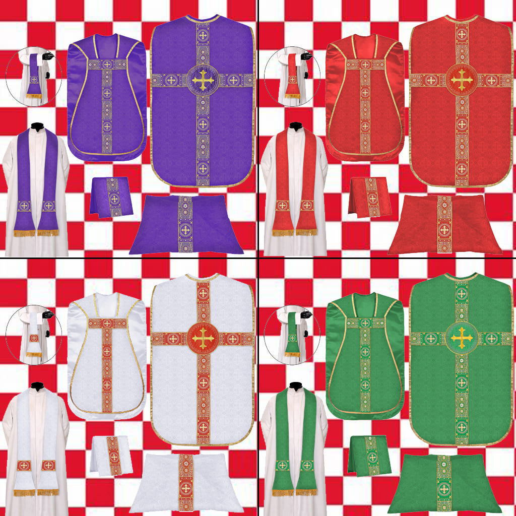 Juego de Casullas Romanas-Guitarra mini cruz: Que incluye, estola, velo, carpeta, manípulo. El interior del todo conjunto esta forrado satinada, casullas con cordón