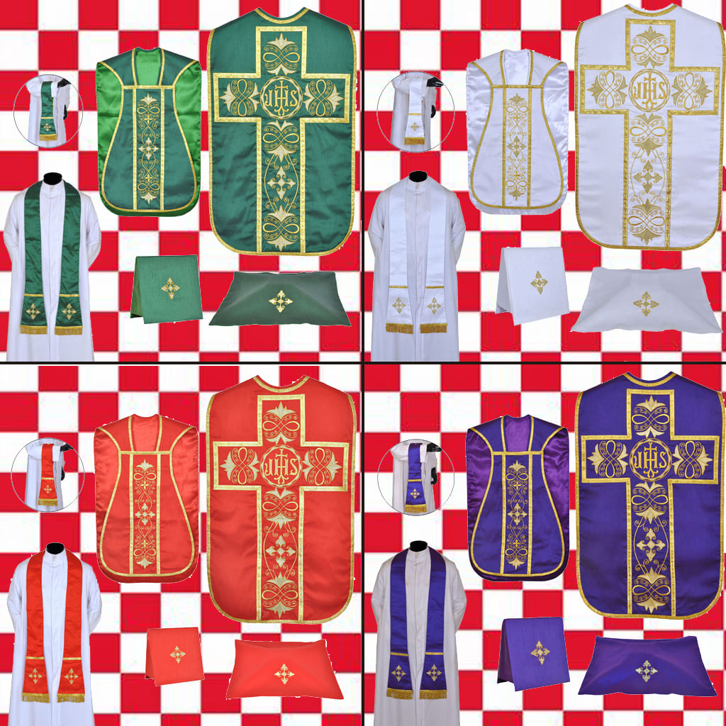 Juego de Casullas Romanas-Guitarra seda: rojo, blanco, verde y morado. Incluye velo cáliz, manípulo, carpeta y estola. Material tejido de seda con diseños en cruz. Orpherys confeccionados tela seda y diseños bordados con hilo dorado metalizado. Interiores forrados tela satin. Cordón a juego con la casulla