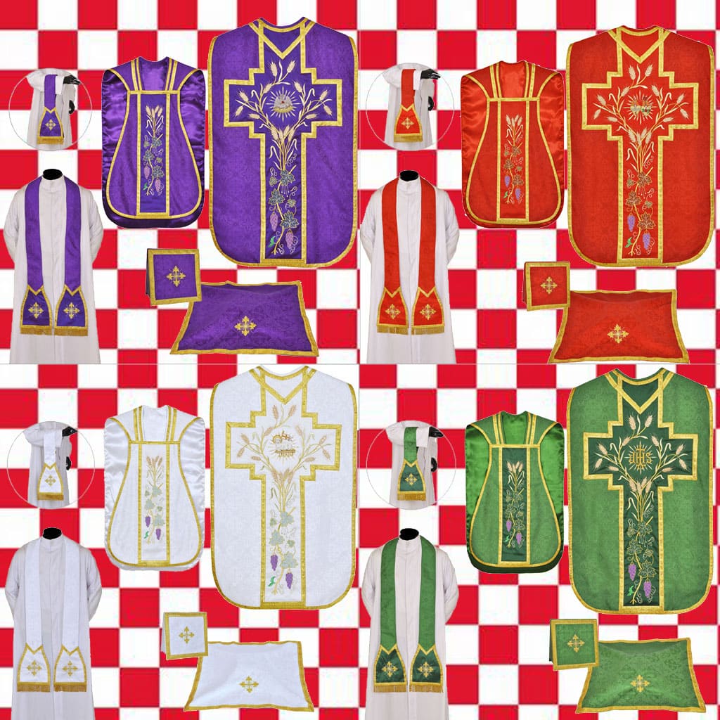 Juego de Casullas Romanas-Guitarra variada. Este diseño de este juego de casulla es una nueva versión del diseño de 1893 con diseños de vid y trigo. El material de las prendas es de Damasco acabado con diseños de Cruz. Los ornamentos están hechos de tela de seda y están bordados con diseños que utilizan diferentes colores y tonos de hilos de imitación metalizados de medio oro. El juego incluye un velo de cáliz, un manípulo, una carpeta del corporal y una estola y el juego completo está bordado con una cruz a juego. Las vestiduras, estolas y manípulos están intercaladas con fieltro y todo el conjunto de masas está forrado con tela satinada a juego desde el exterior. La casulla viene con los cordones adjuntos y la estola y el manípulo están terminados con flecos de oro de calidad fina en los extremos. Cada color, contiene diferente simbología.