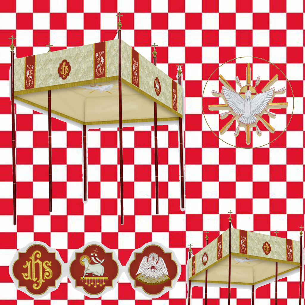Palio procesional confeccionado de tela de brocado y bordado con diseños florales en varios colores. El frontal viene en diferentes tamaños. La altura de los cuatro lados es de 35,56 cm incluidas las franjas de 5 cm en la parte inferior. Bordados JHS, AM, Agnus Dei y Pelicano en cada lado. Dentro del palio procesional en la parte superior interior tenemos el Espíritu Santo. No incluye los postes.