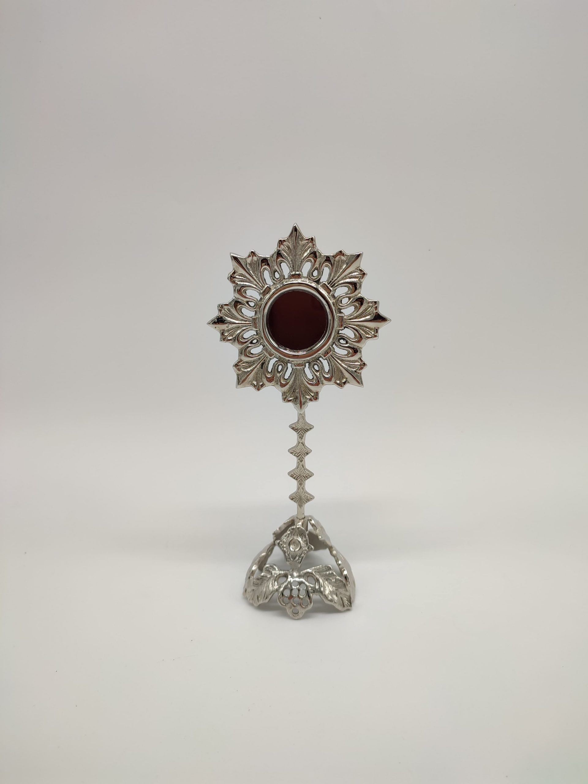 Relicario alfa plateado con diseños nunca vistos en la base y en la circunferencia. Las medidas son 19,5 cm de alto x 9,5 cm ancho. Porta reliquias 4,1 cm (diámetro) x 2,4 cm (profundo). Disponible en varios acabados.