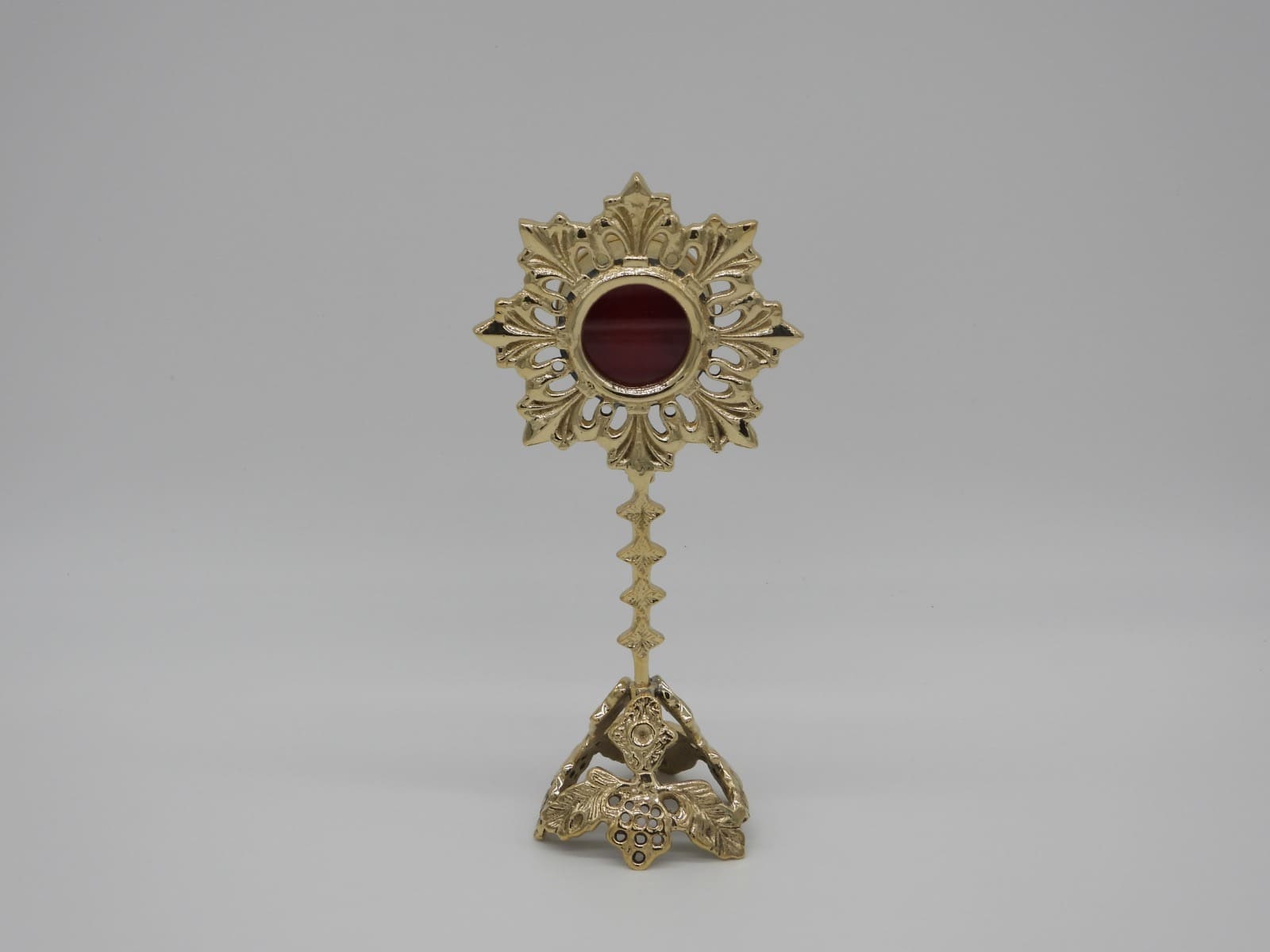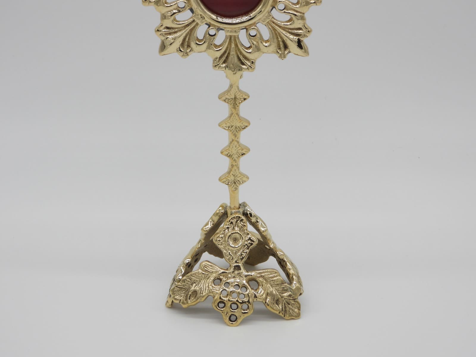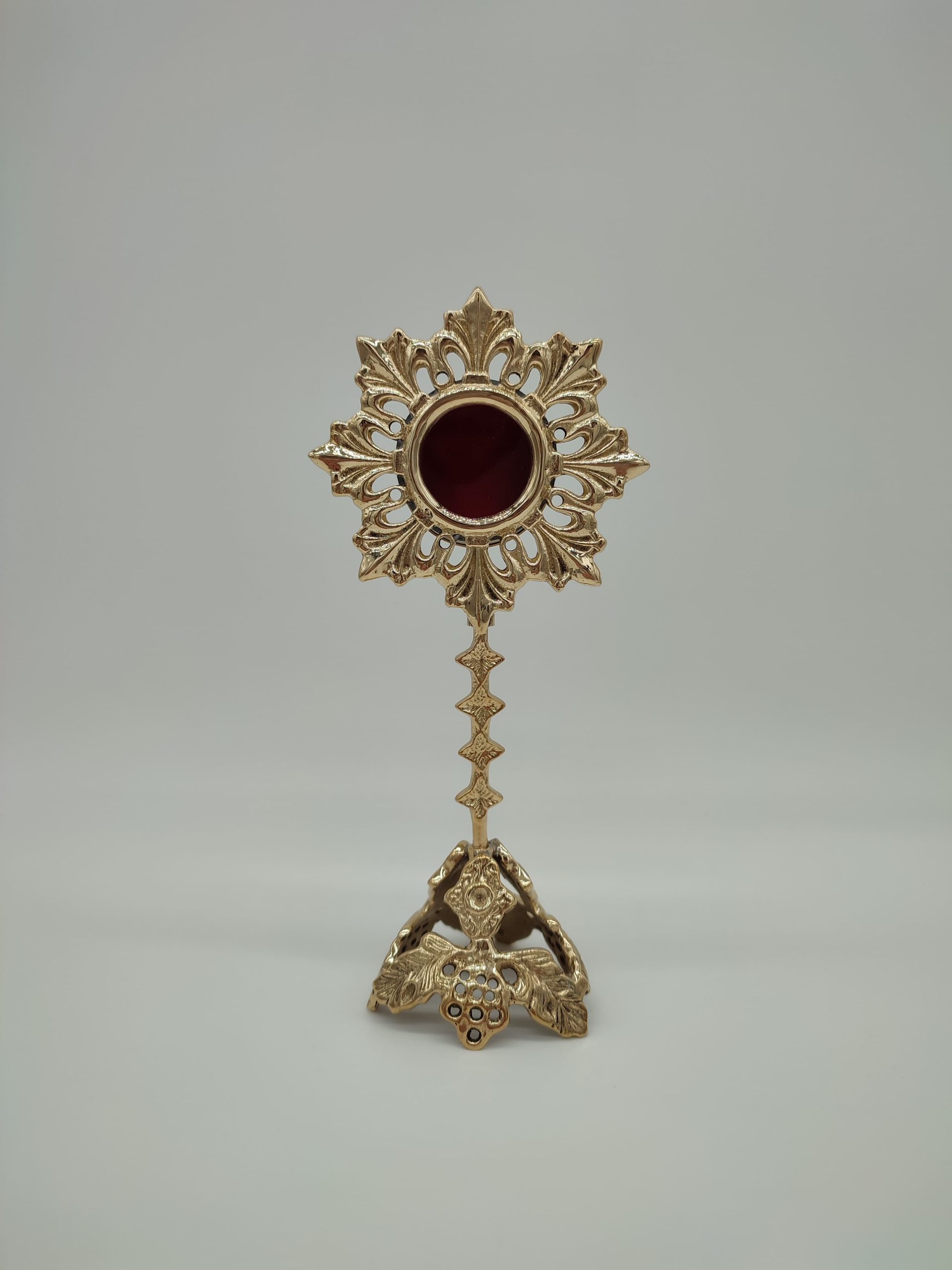 Relicario alfa de latón con diseños nunca vistos en la base y en la circunferencia. Las medidas son 19,5 cm de alto x 9,5 cm ancho. Porta reliquias 4,1 cm (diámetro) x 2,4 cm (profundo). Disponible en varios acabados. Este modelo alto pulido dorado.