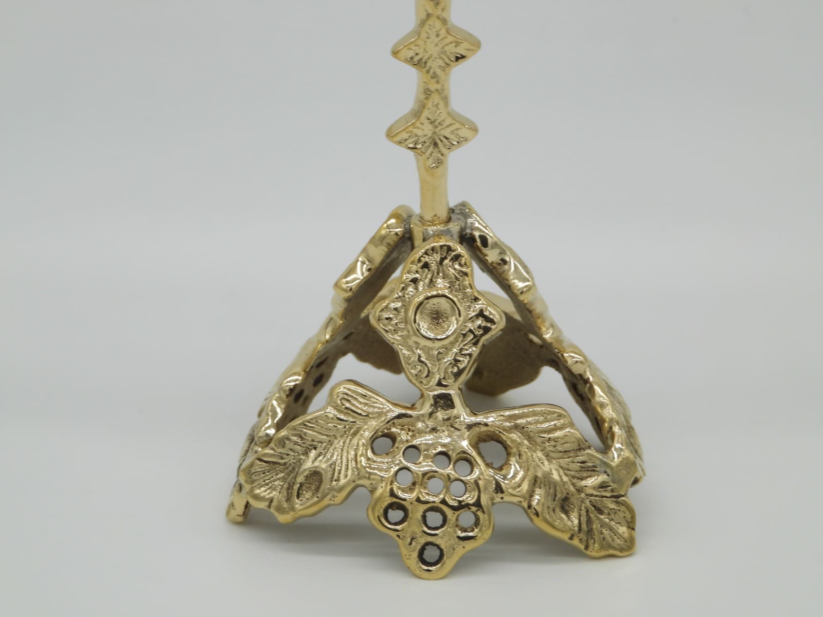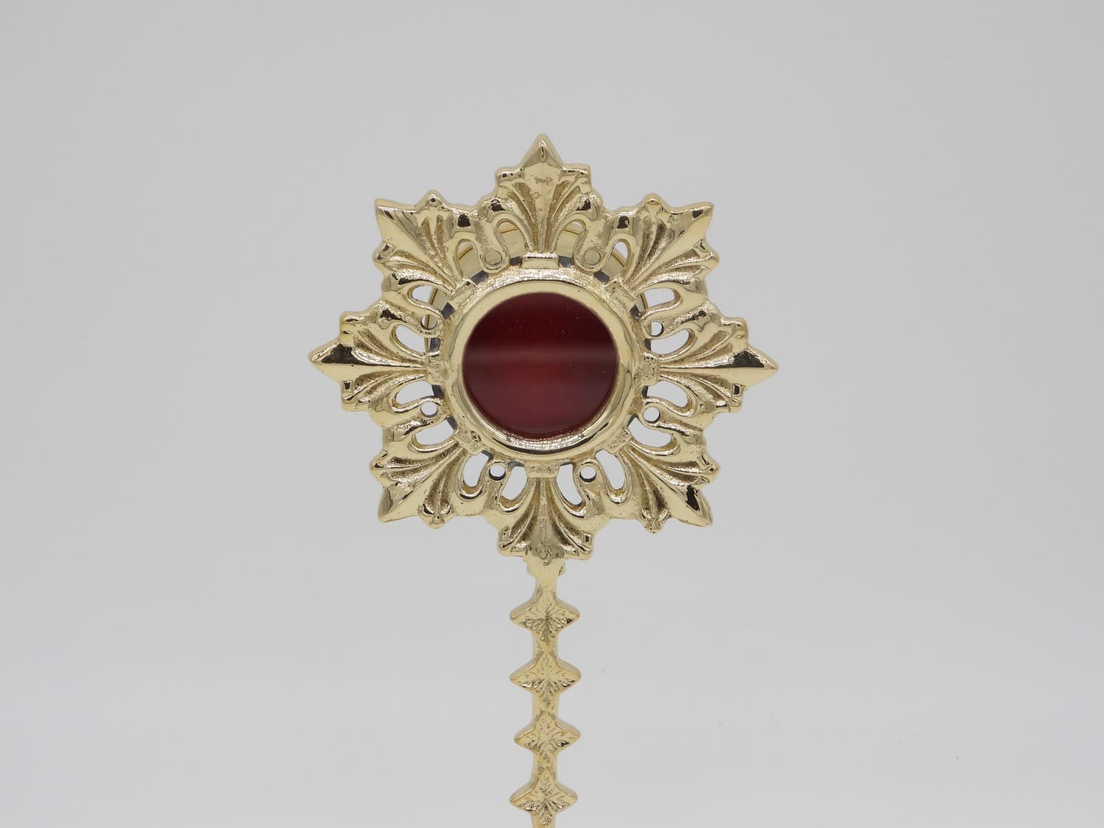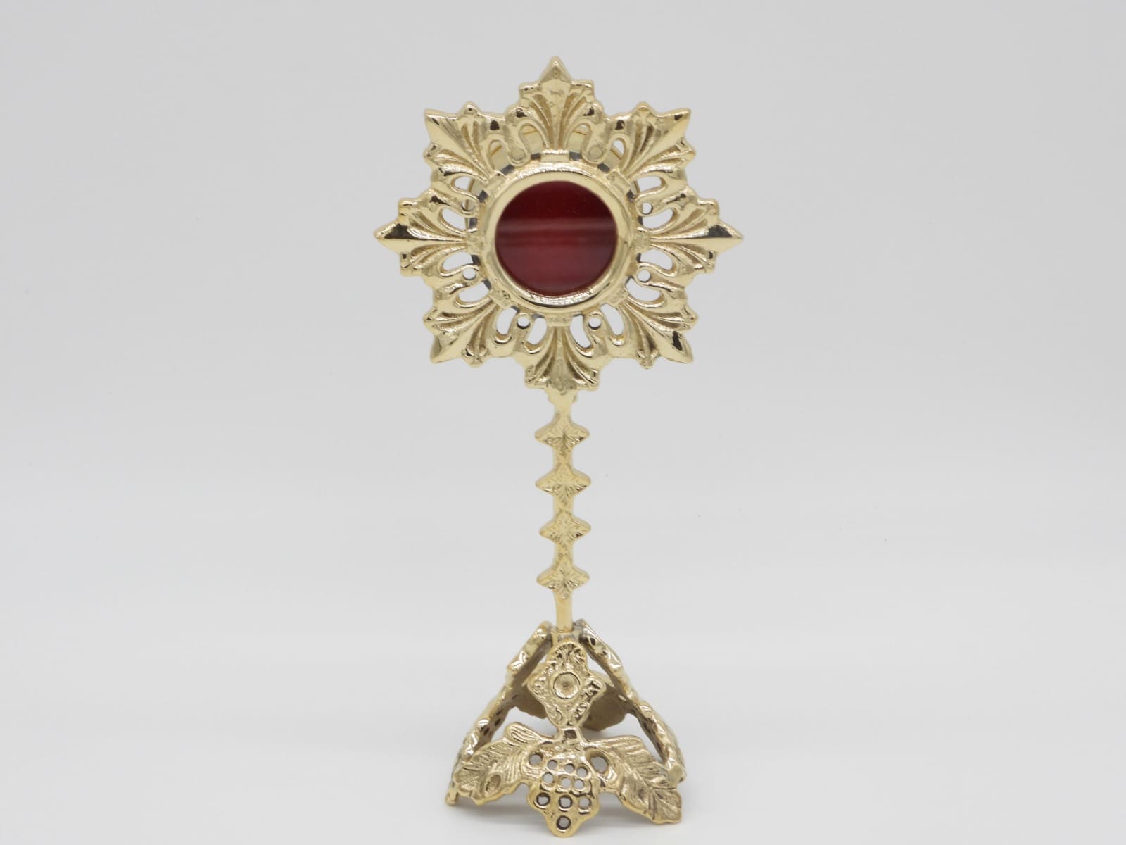 Relicario alfa de latón con diseños nunca vistos en la base y en la circunferencia. Las medidas son 19,5 cm de alto x 9,5 cm ancho. Porta reliquias 4,1 cm (diámetro) x 2,4 cm (profundo). Disponible en varios acabados. Este modelo alto pulido dorado.