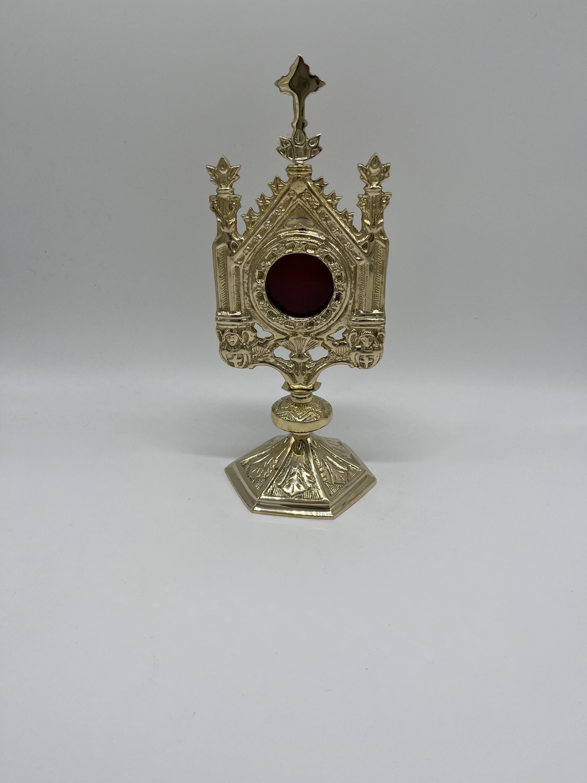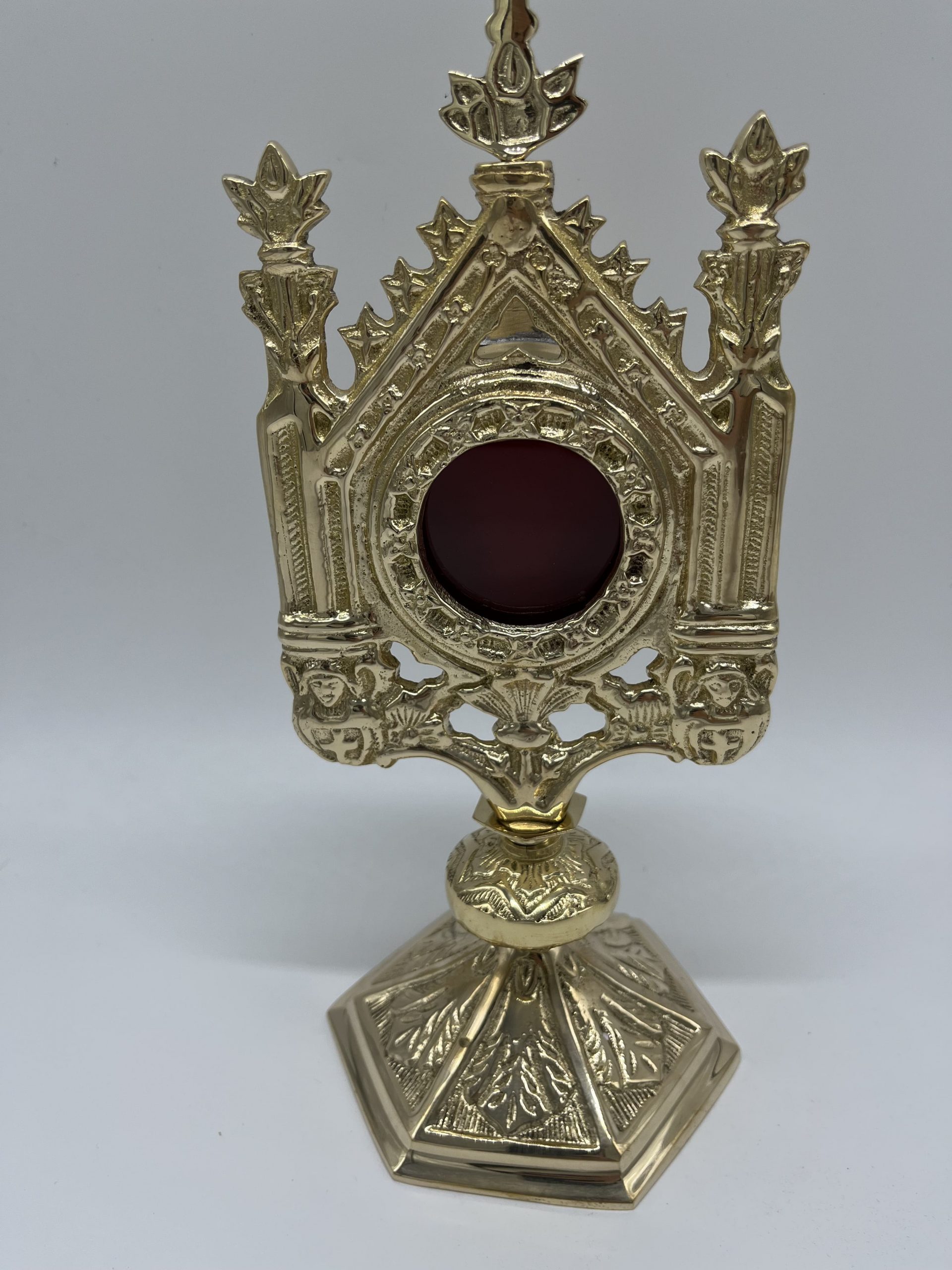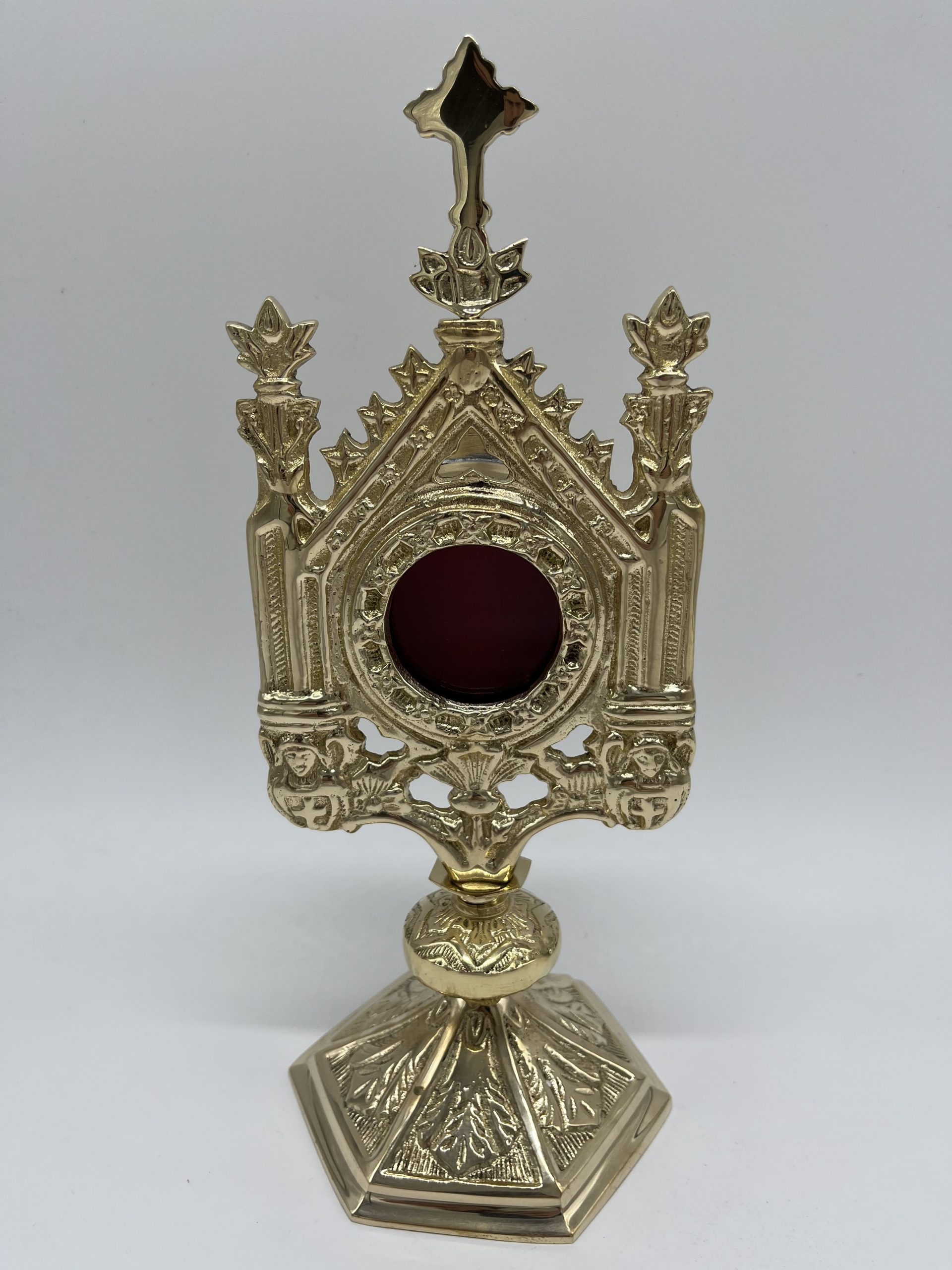 Relicario altar de latón con diferentes adornos y diseños asombrosos. Las medidas del relicario son 31 cm de alto x 12,1 cm de ancho. El porta reliquias 7 cm de diámetro x 3,4 cm de profundo. Disponible con estuche y en varios acabados; en estilo antiguo, niquelado (plateado) y chapado en oro.