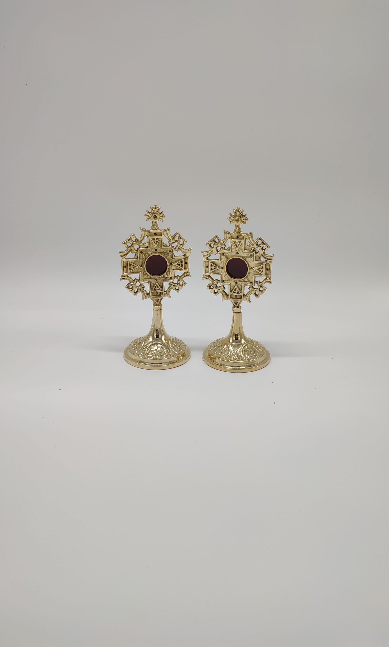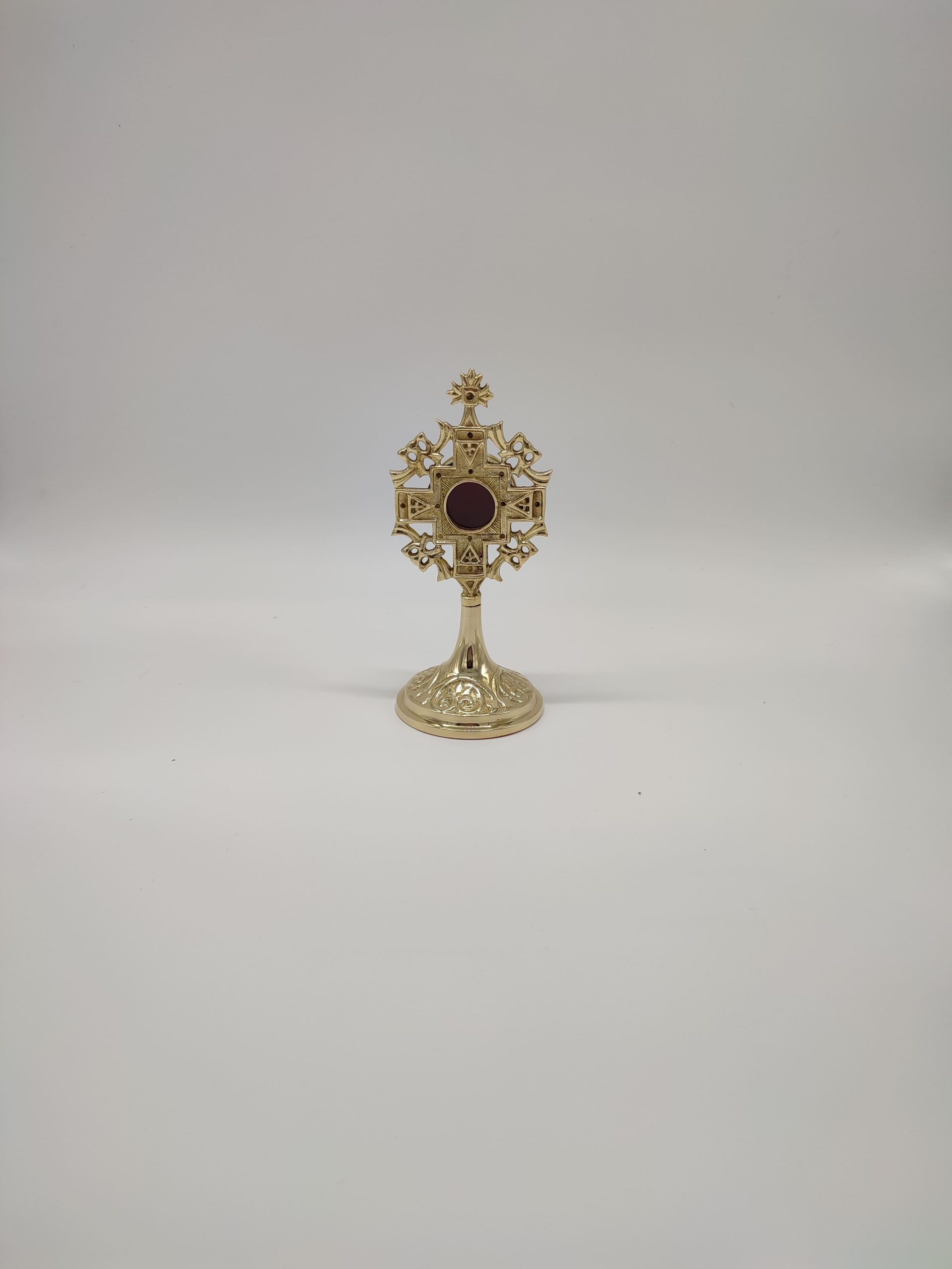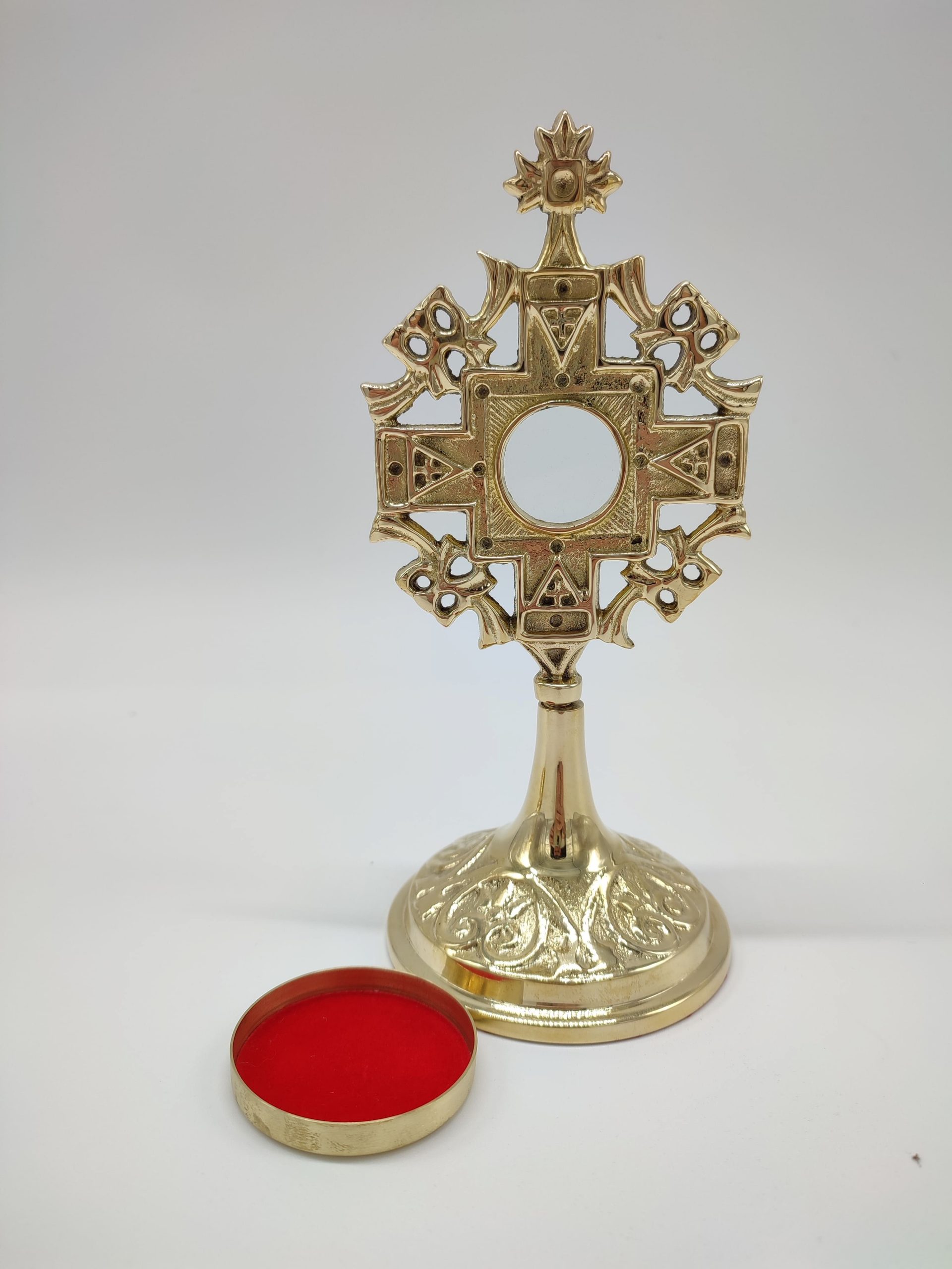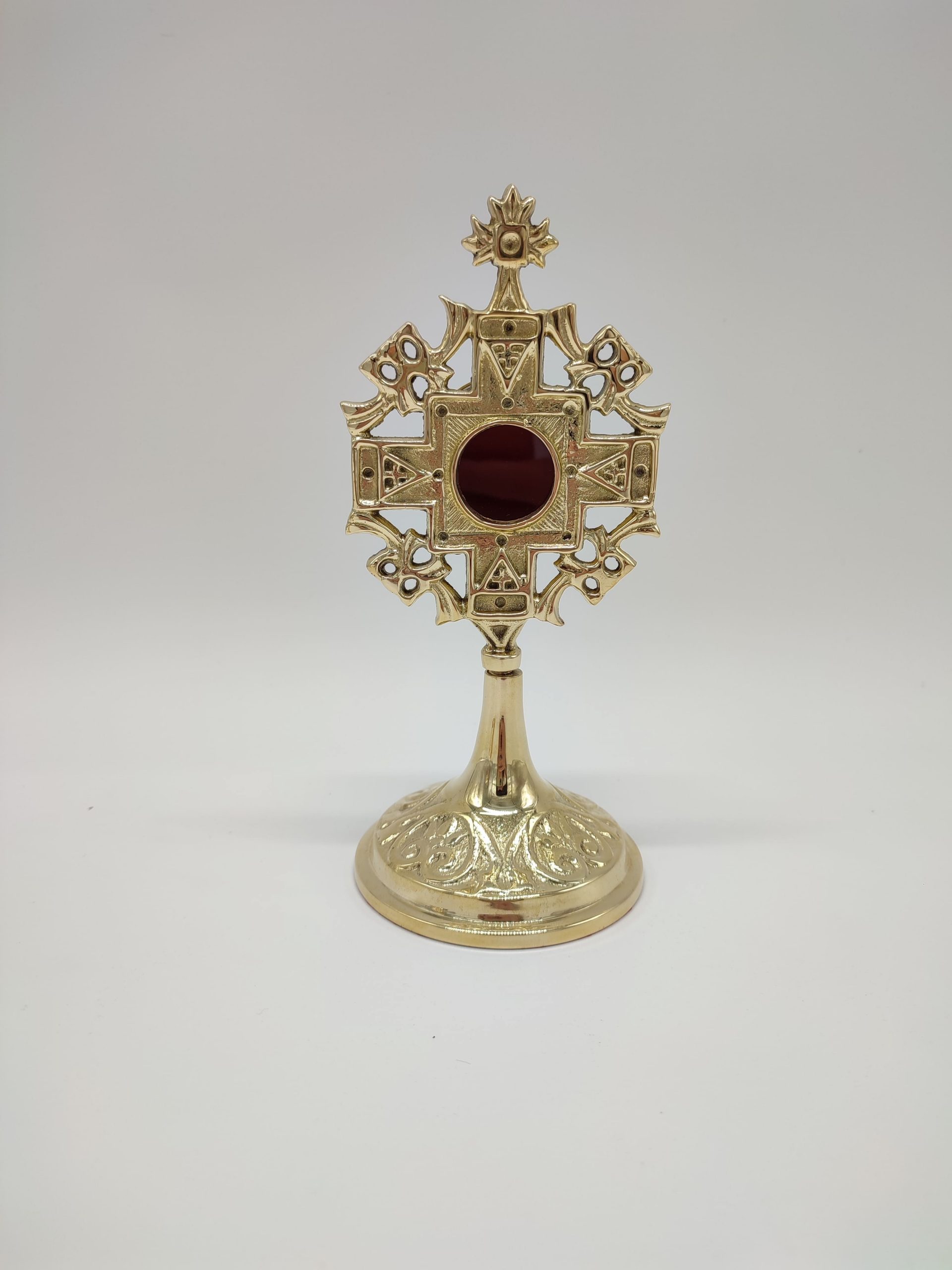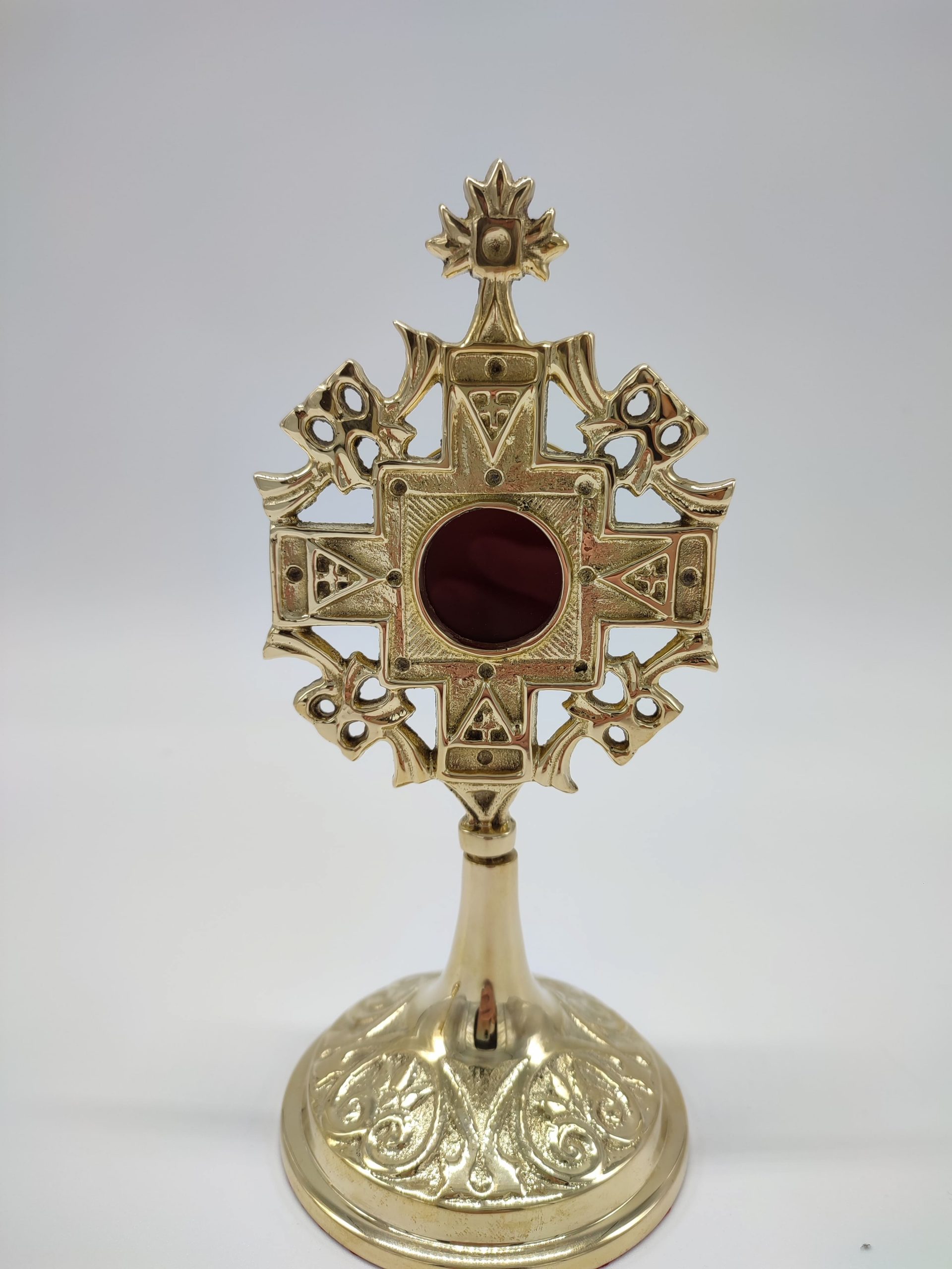 Relicario cruz ostensorio con diseños muy labrados en base y todo el alrededor del relicario. Las medidas son 21,3 cm de alto x 10,2 cm ancho. Las medidas del porta reliquias 4,7 cm x 2,3 cm de profundidad. Disponible con estuche y distintos acabados (lacado antiguo, niquelado plateado y chapado en oro) este modelo es alto pulido.