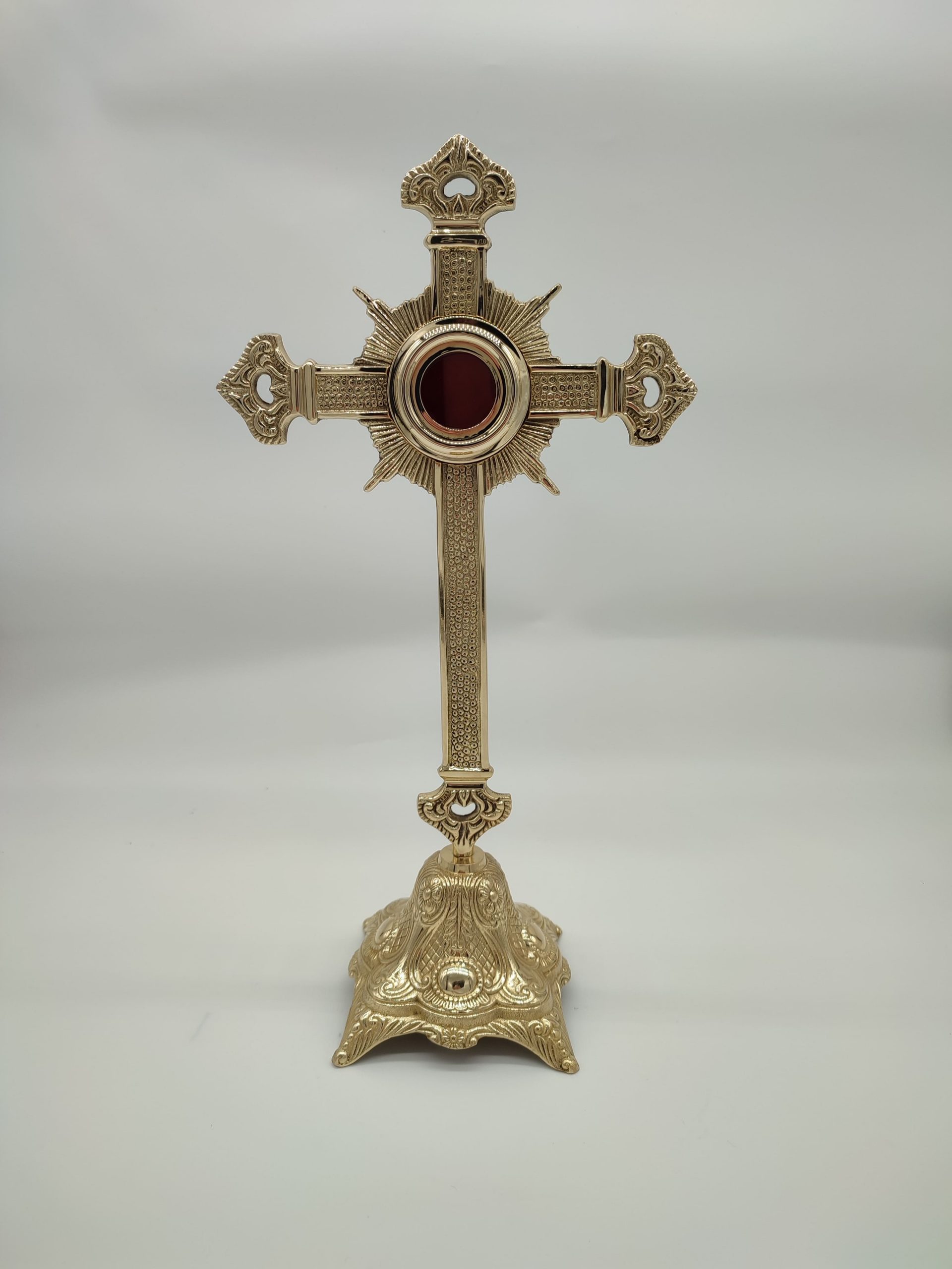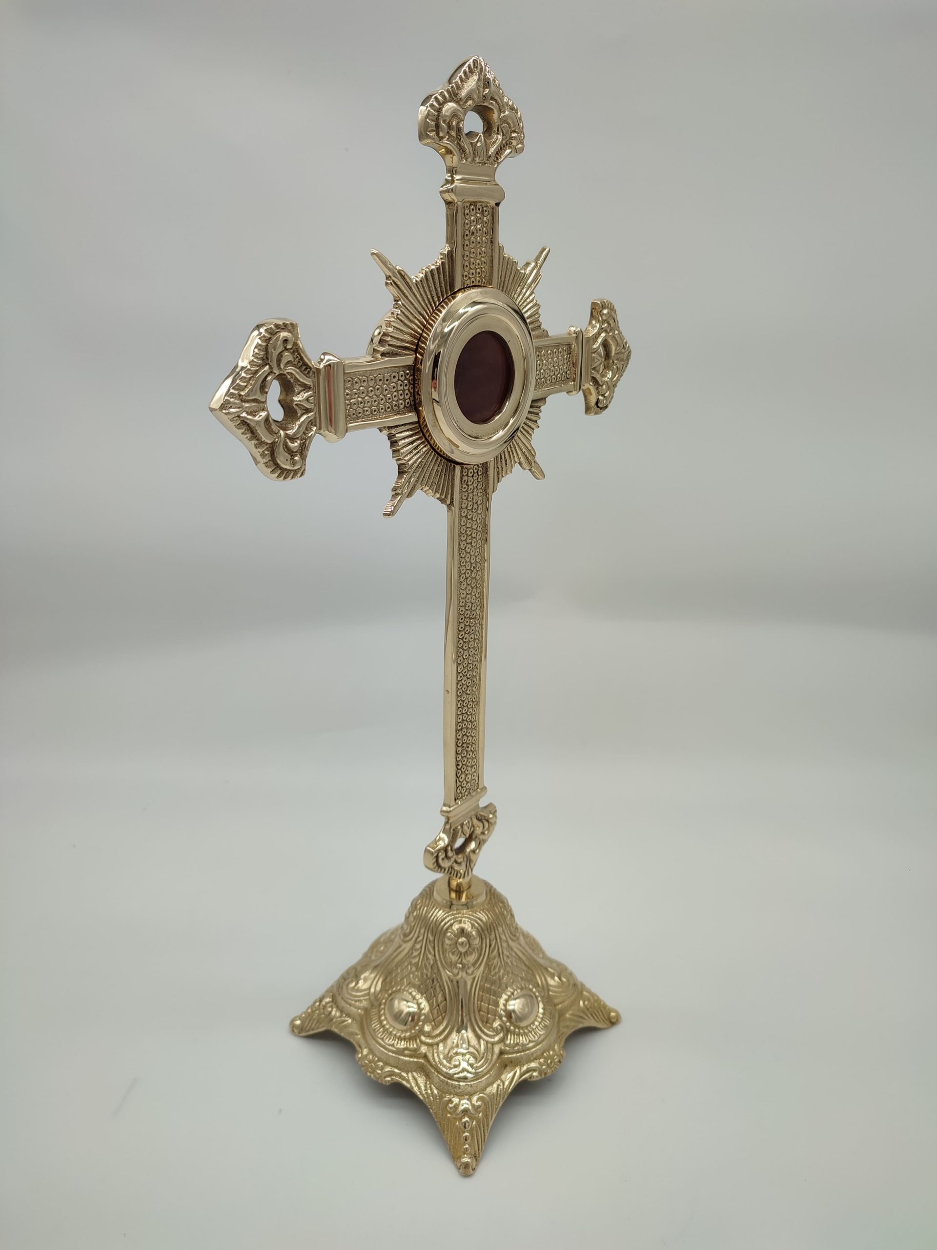 Relicario cruzado de latón con diseño de cruz y tallado en el mismo. Las medidas 41 cm de alto x 21,5 cm. El porta reliquias 4,8 cm (diámetro) x 2,4 cm profundo. Disponible en varios acabados y con estuche.