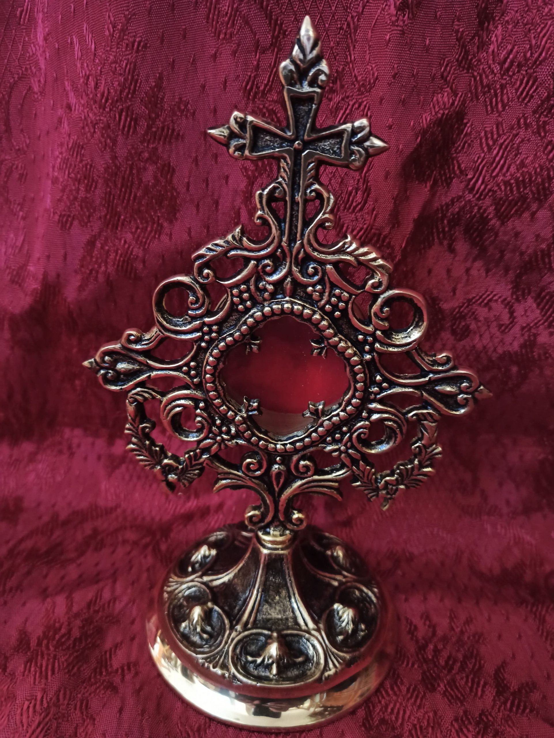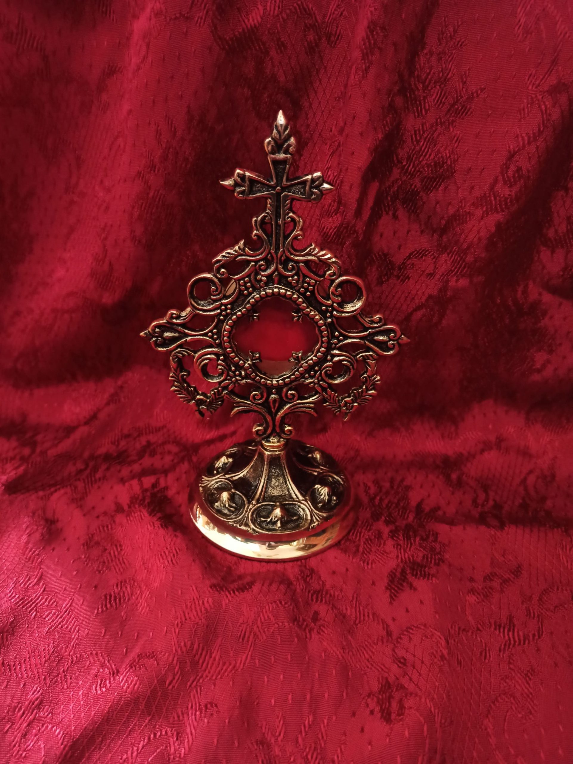 Relicario iglesia antiguo de latón estilo antiguo. Con diseños exclusivos por parte nuestra que ofrecen una elegancia. Las medidas son 24 cm alto x 16 cm ancho. El porta reliquias 6cm x 2,5 de profundo. Disponible con estuche y en varios acabados. Este modelo es el estilo antiguo.