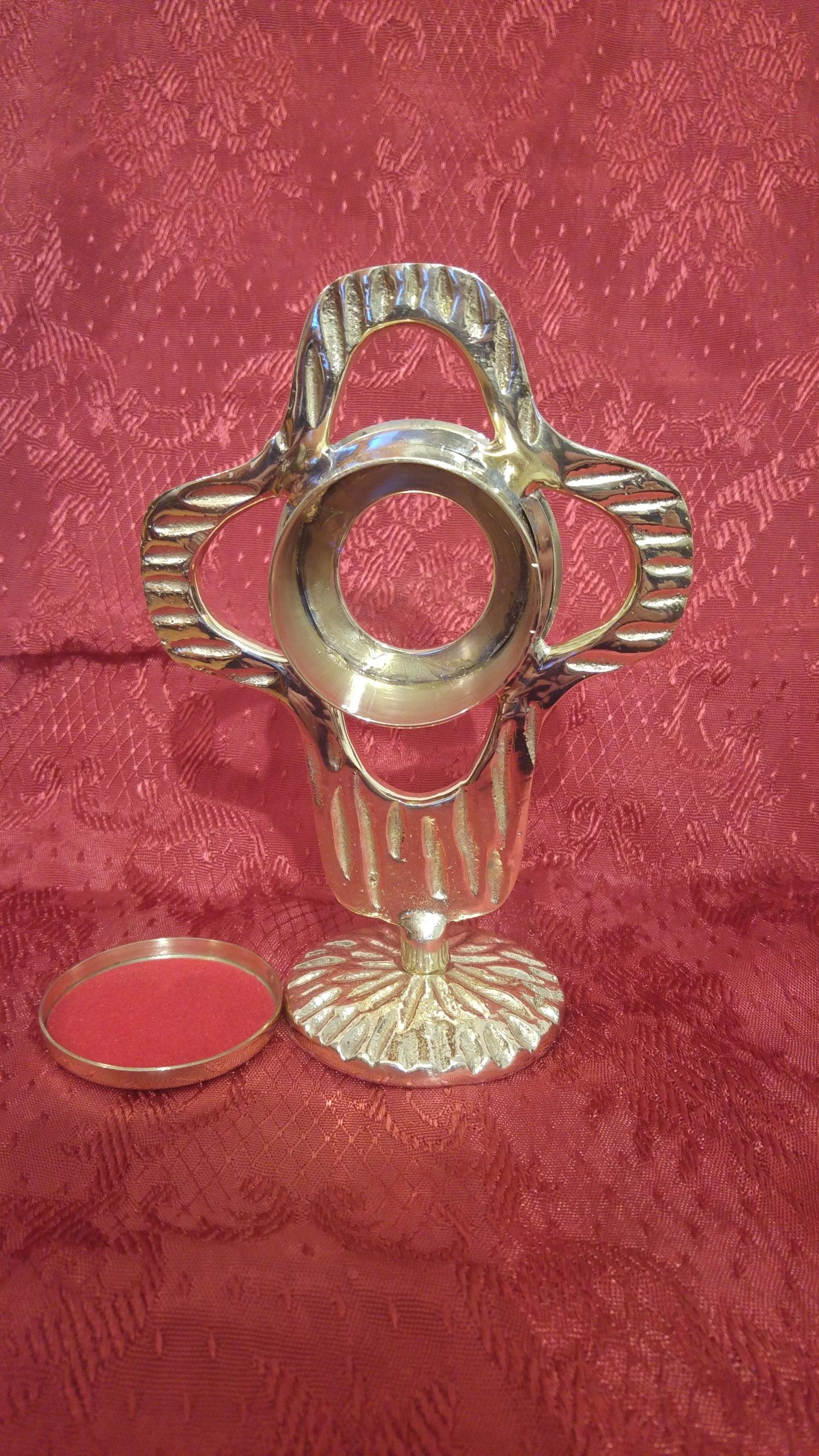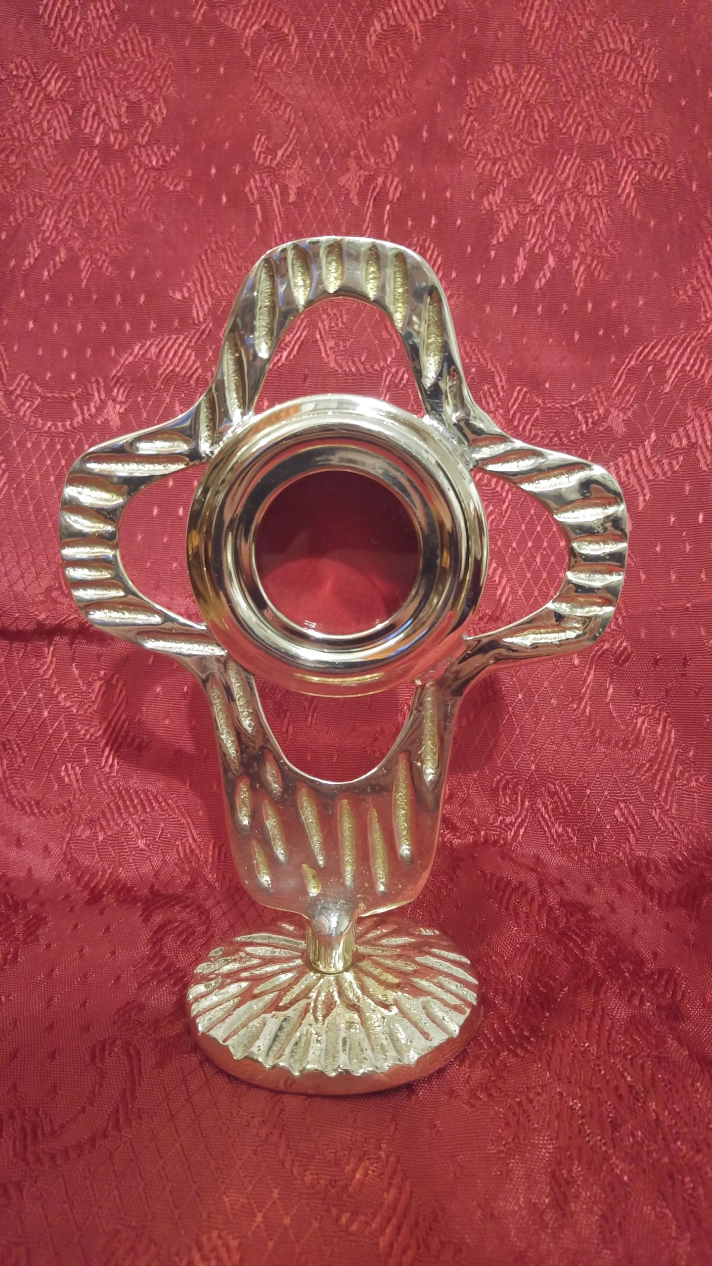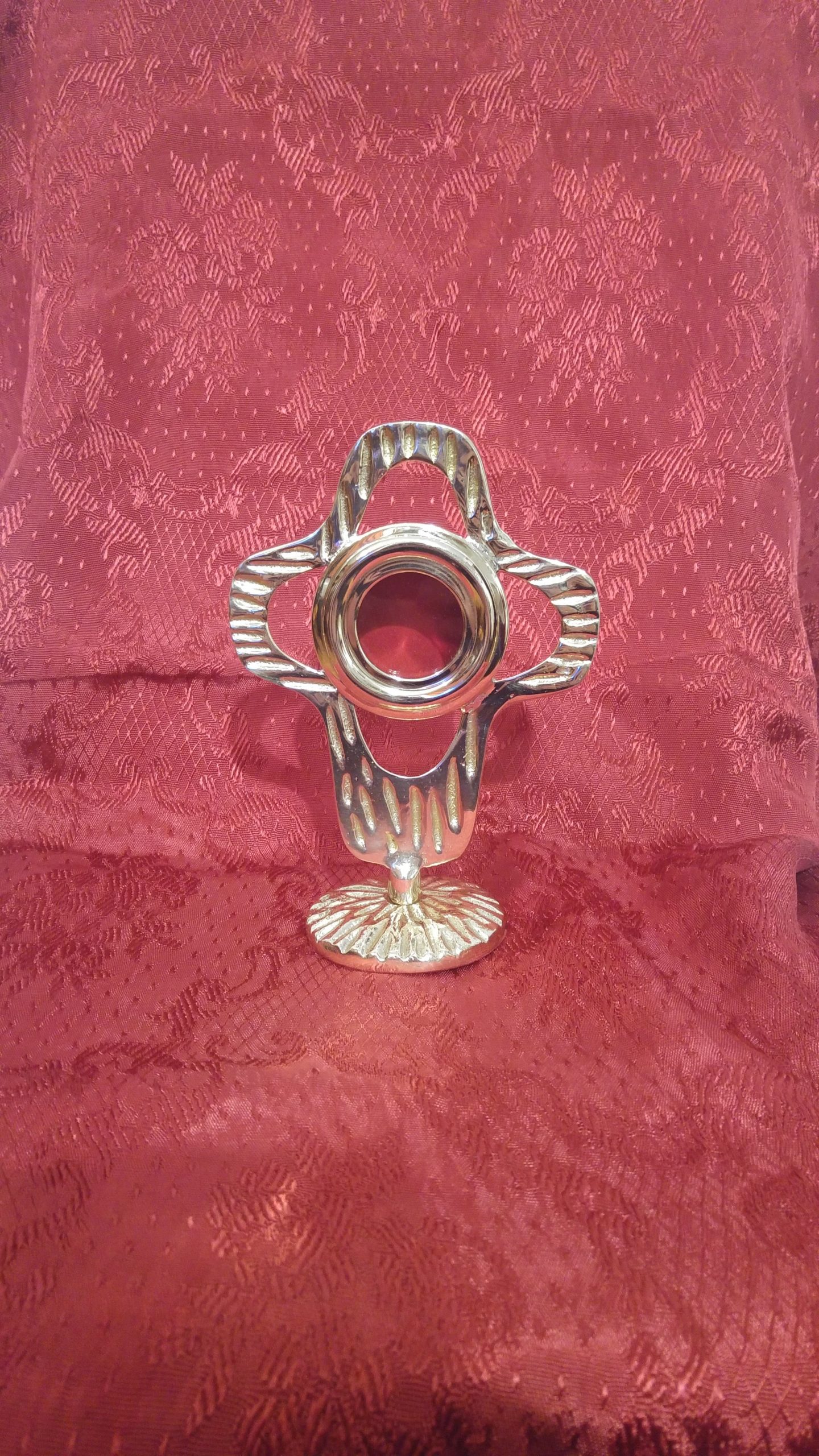 Relicario Modernista ,decorado con una Cruz esférica que bordea toda la pieza. Las medidas son 16 cm de alto x 11,5 cm ancho. El porta reliquias mide 4,7 cm x 2,3 cm de profundo y la base 6,5 cm. Disponible también con estuche y en varios acabados.