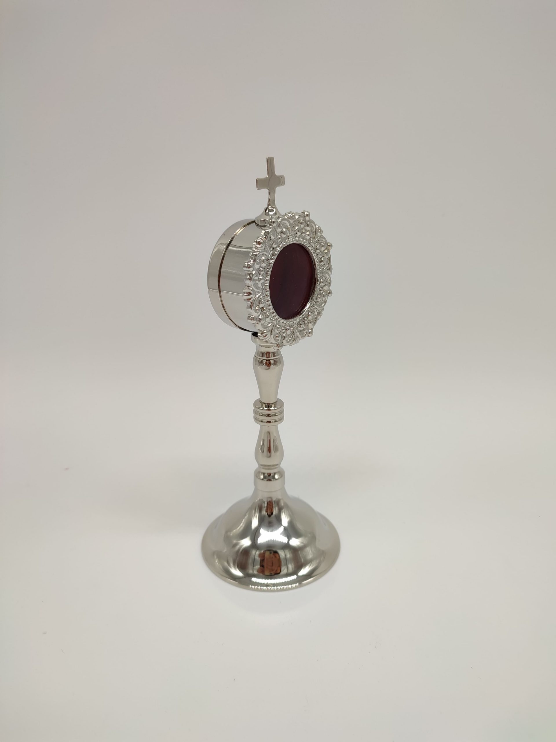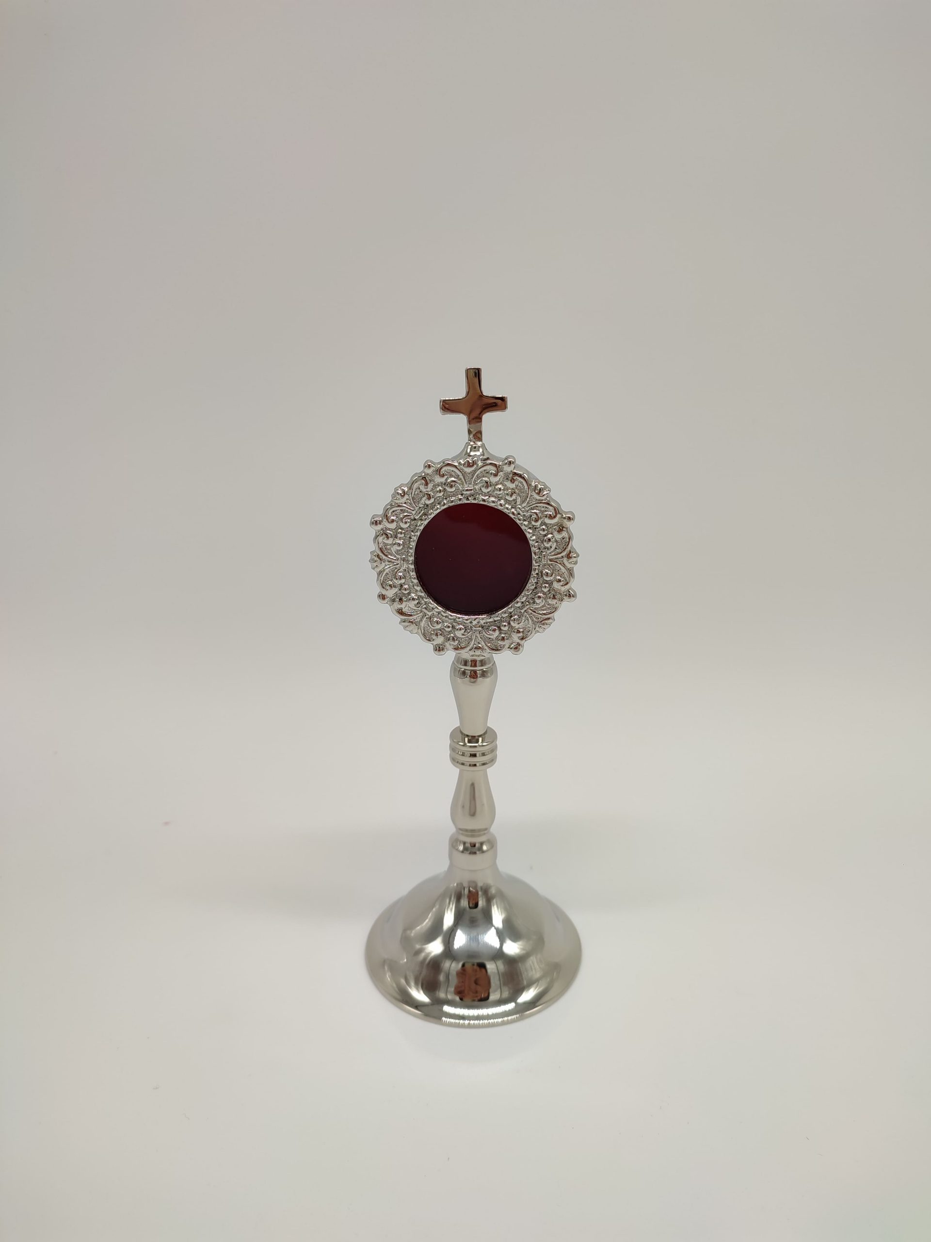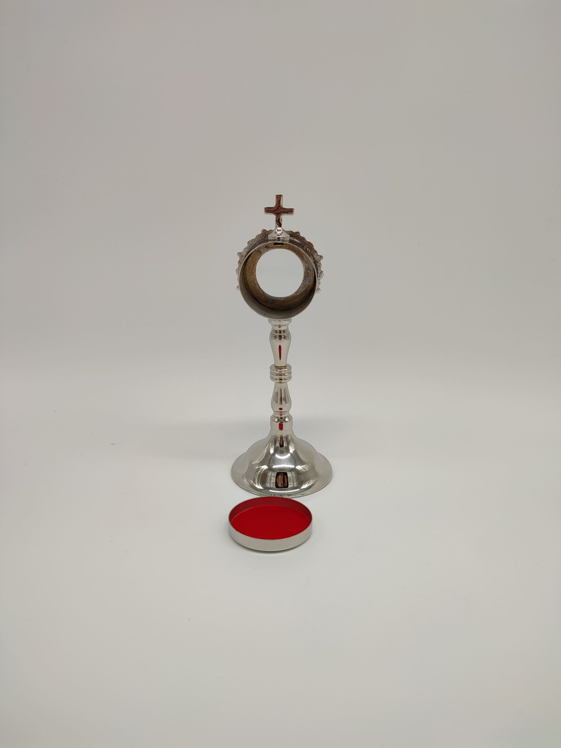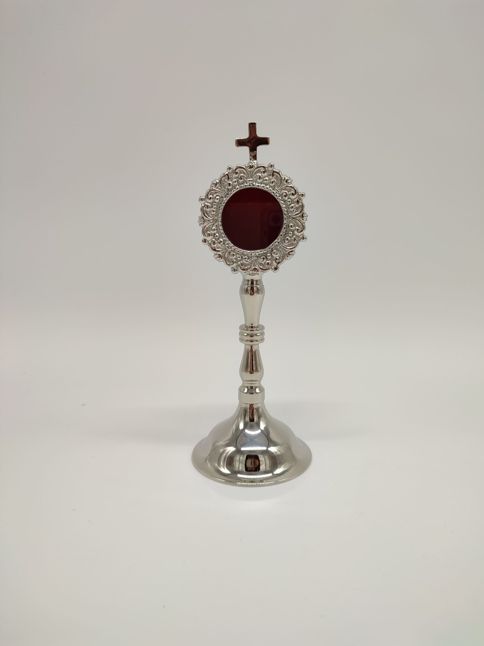 Relicario plateado de latón muy atractivo y llamativo ideal para guardar su reliquia. Las medidas 19 cm de alto x 7,5 cm de ancho. El porta reliquias mide 4,8 cm x 2,3 cm de profundo. Disponible con estuche y en varios acabados. Este modelo niquelado (Plateado)