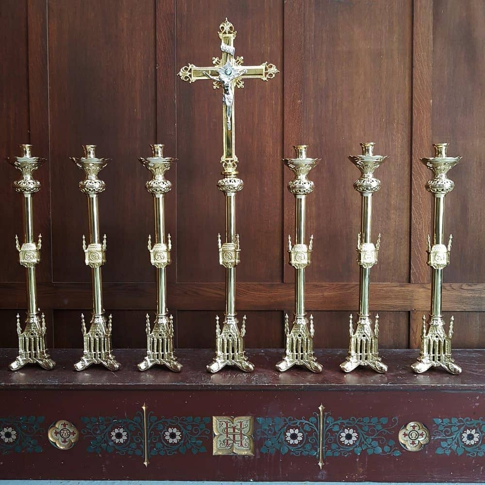 Set Candelabros + cruz altar góticos de 7 piezas de latón, disponible también en plateado. Cruz: 96 cm x 30 cm. Candelabros: 68 cm x 13 cm