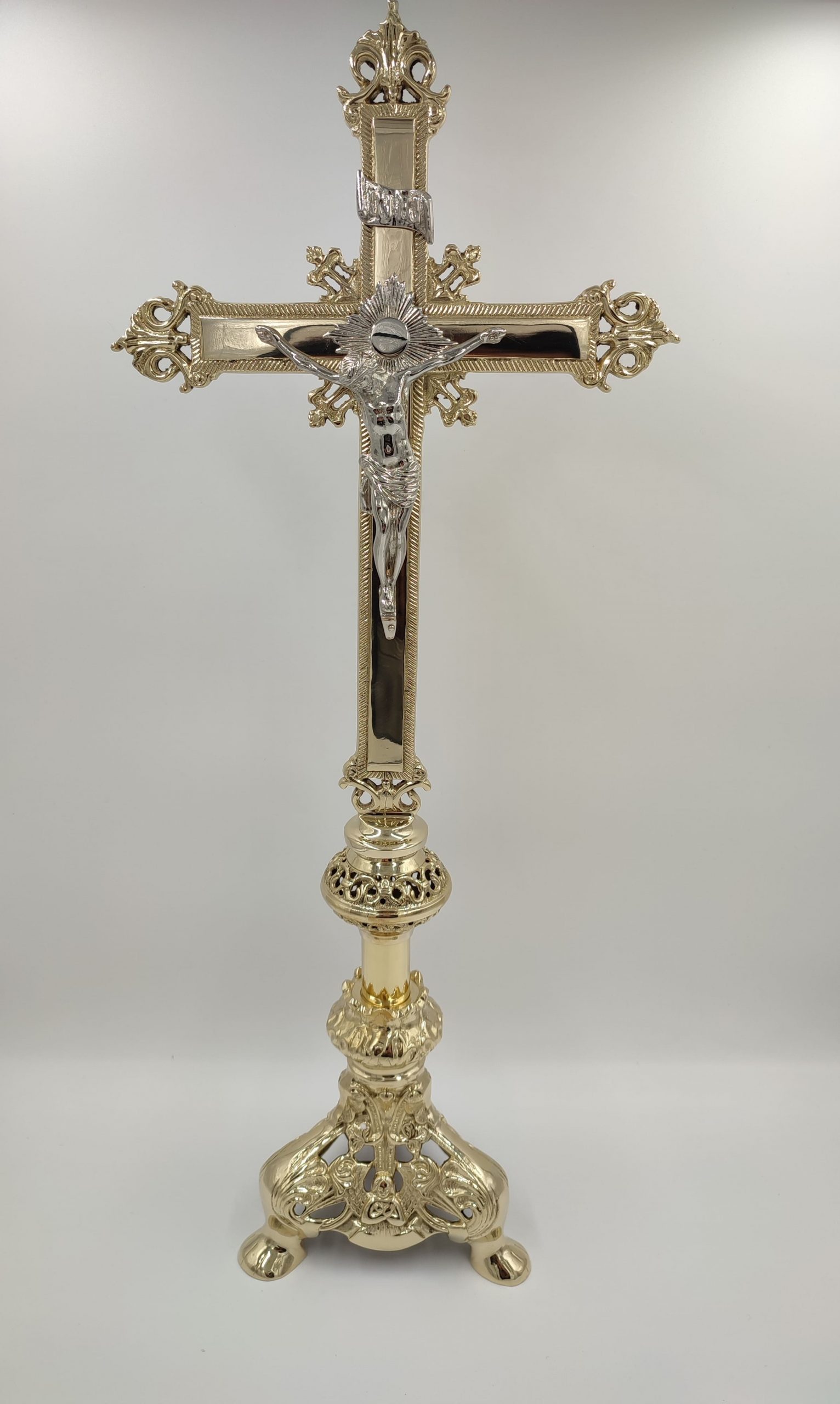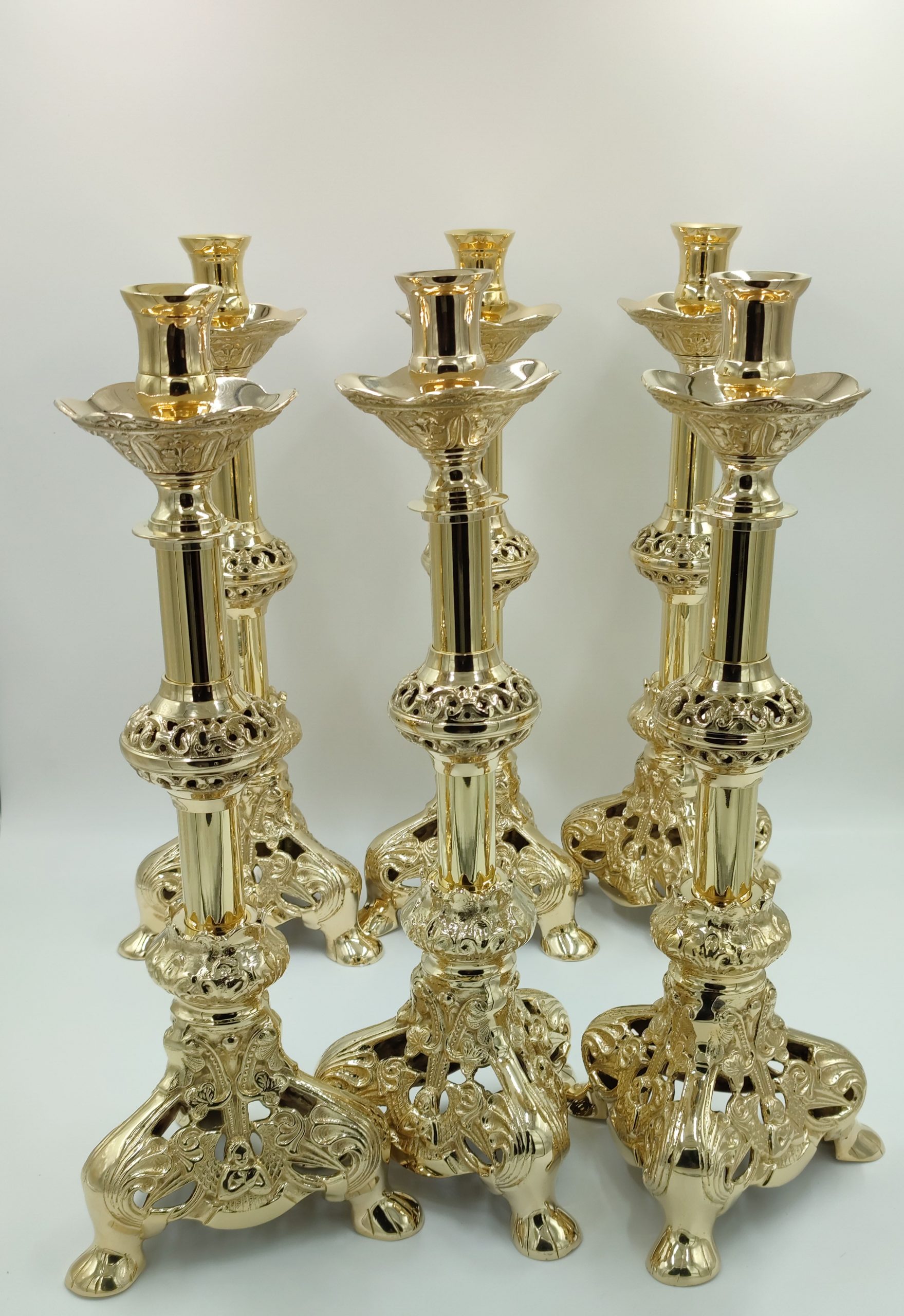 Set candelabros + Cruz altar plateado eucarístico que incluye: Seis candelabros y una cruz de altar, total 7 piezas. Diámetro de vela 2,54 cm (el diámetro a elegir). Los Candelabros disponibles en 50 cm, 75 cm 90 cm y 1 metro. Este set es de 50 cm. Acabados en plateado y chapado